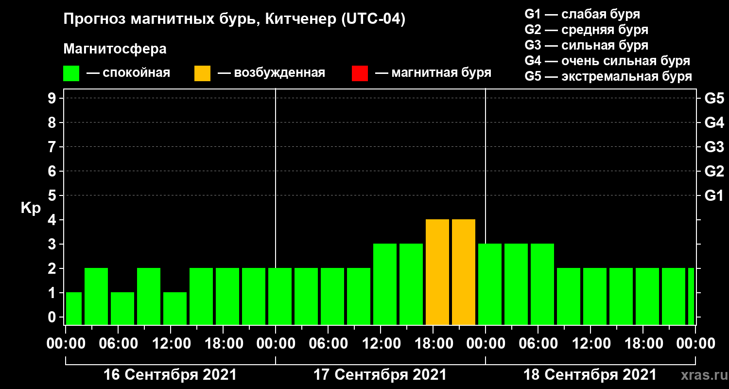 Прогноз магнитных бурь в Китченере на 16 сентября 2021 года