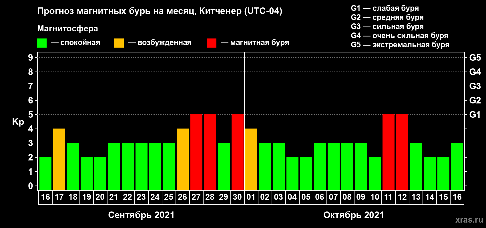 Прогноз магнитных бурь в Китченере — 16 сентября 2021 года