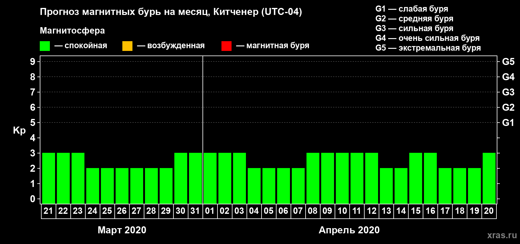 Прогноз магнитных бурь в Китченере на 21 марта 2020 года