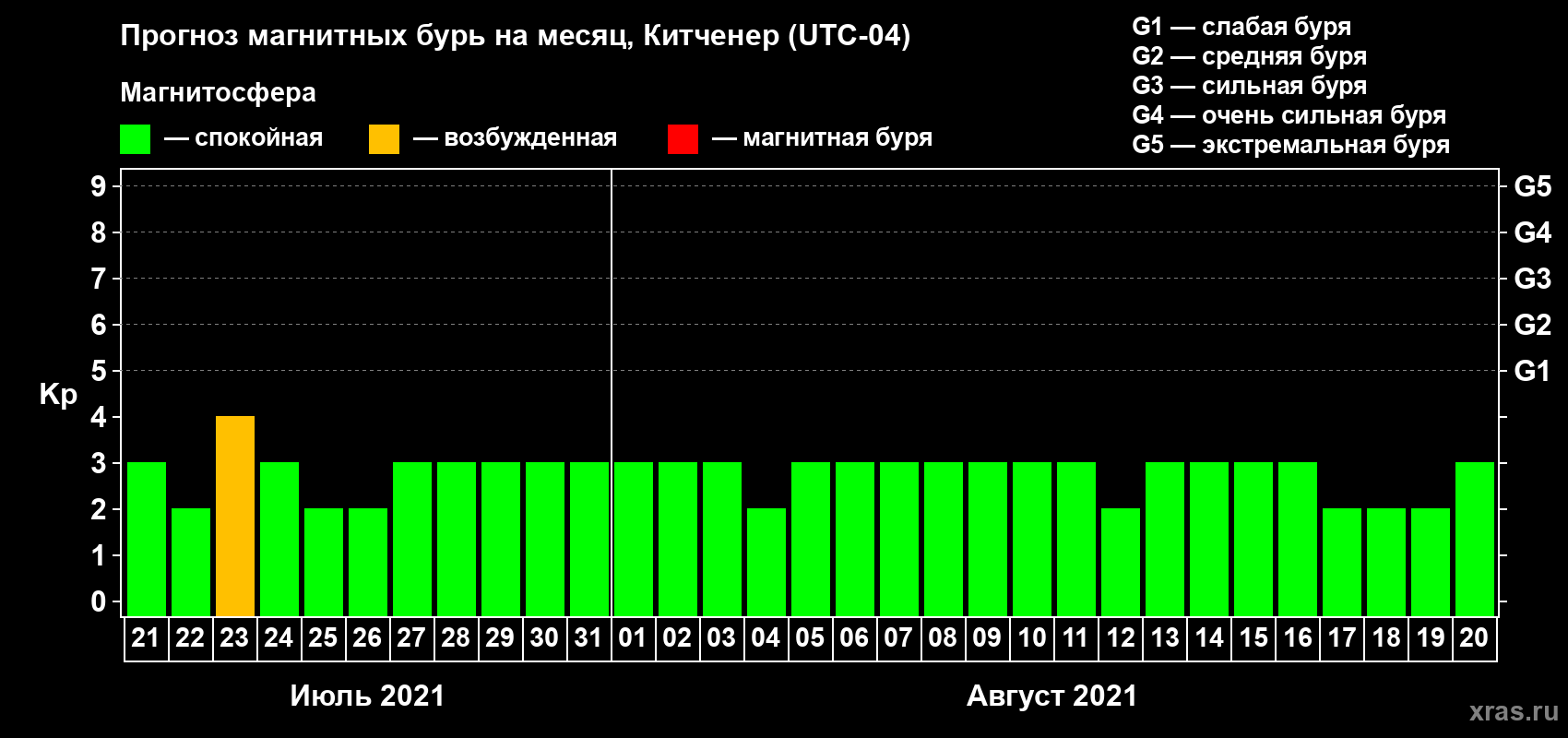 Прогноз магнитных бурь в Китченере на 21 июля 2021 года
