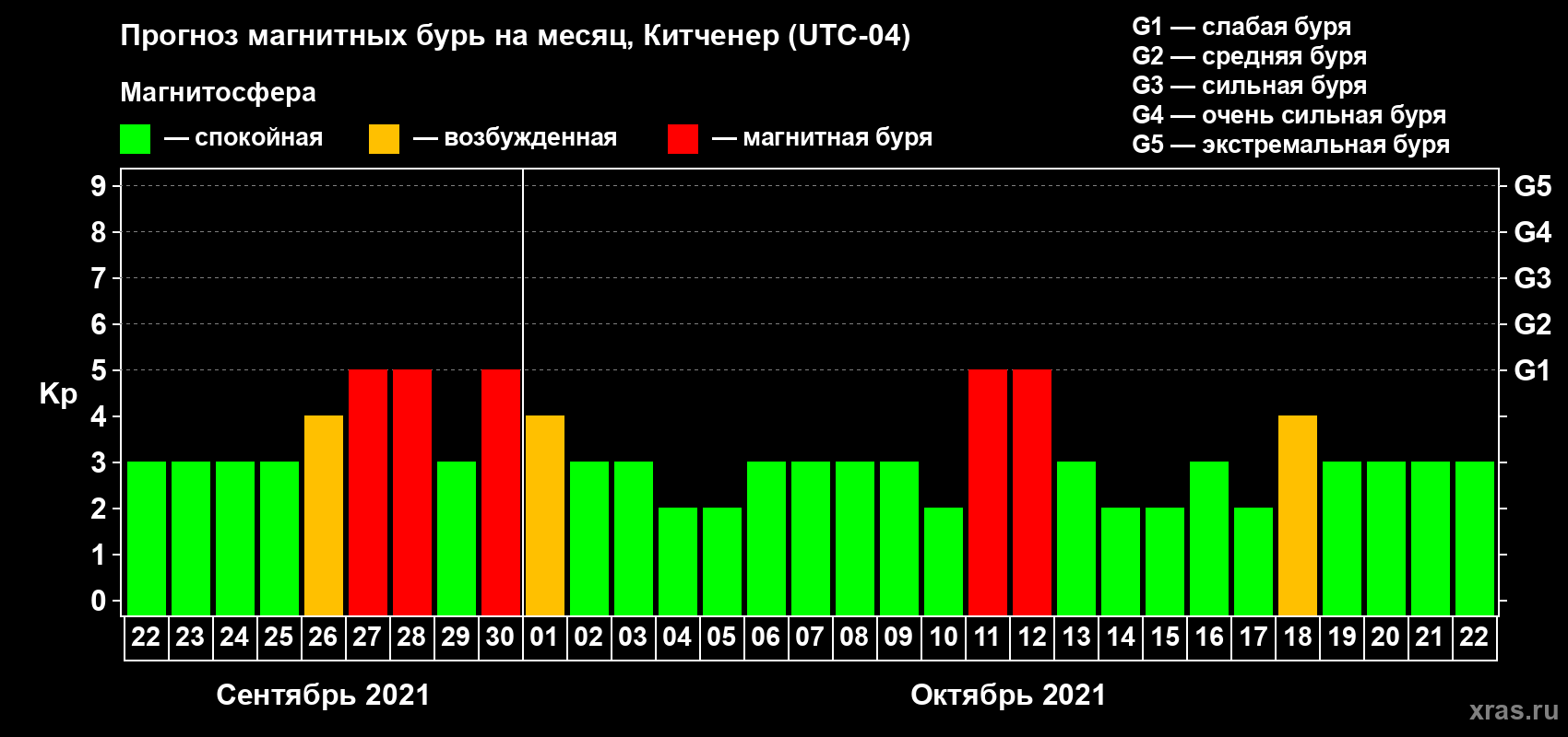 Прогноз магнитных бурь в Китченере — 22 сентября 2021 года