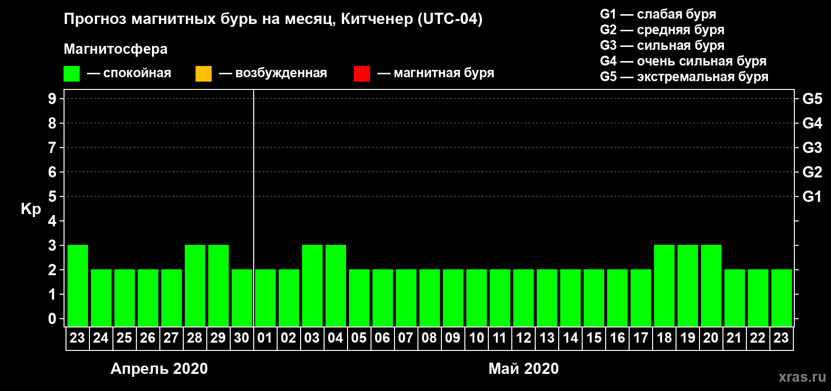 Прогноз магнитных бурь в Китченере на 23 апреля 2020 года