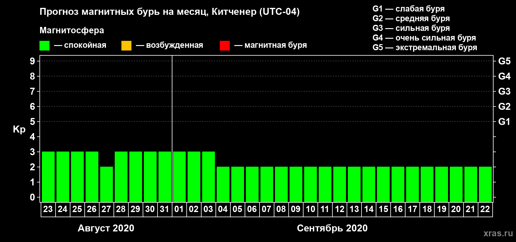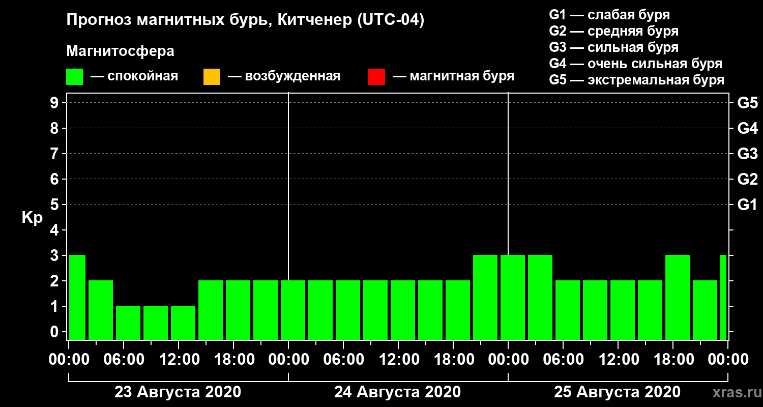 Прогноз магнитных бурь в Китченере на 23 августа 2020 года