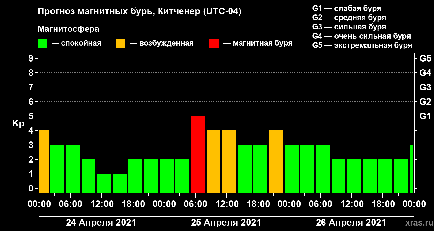 Прогноз магнитных бурь в Китченере на 24 апреля 2021 года