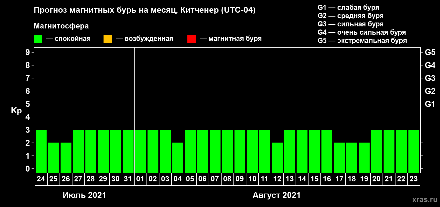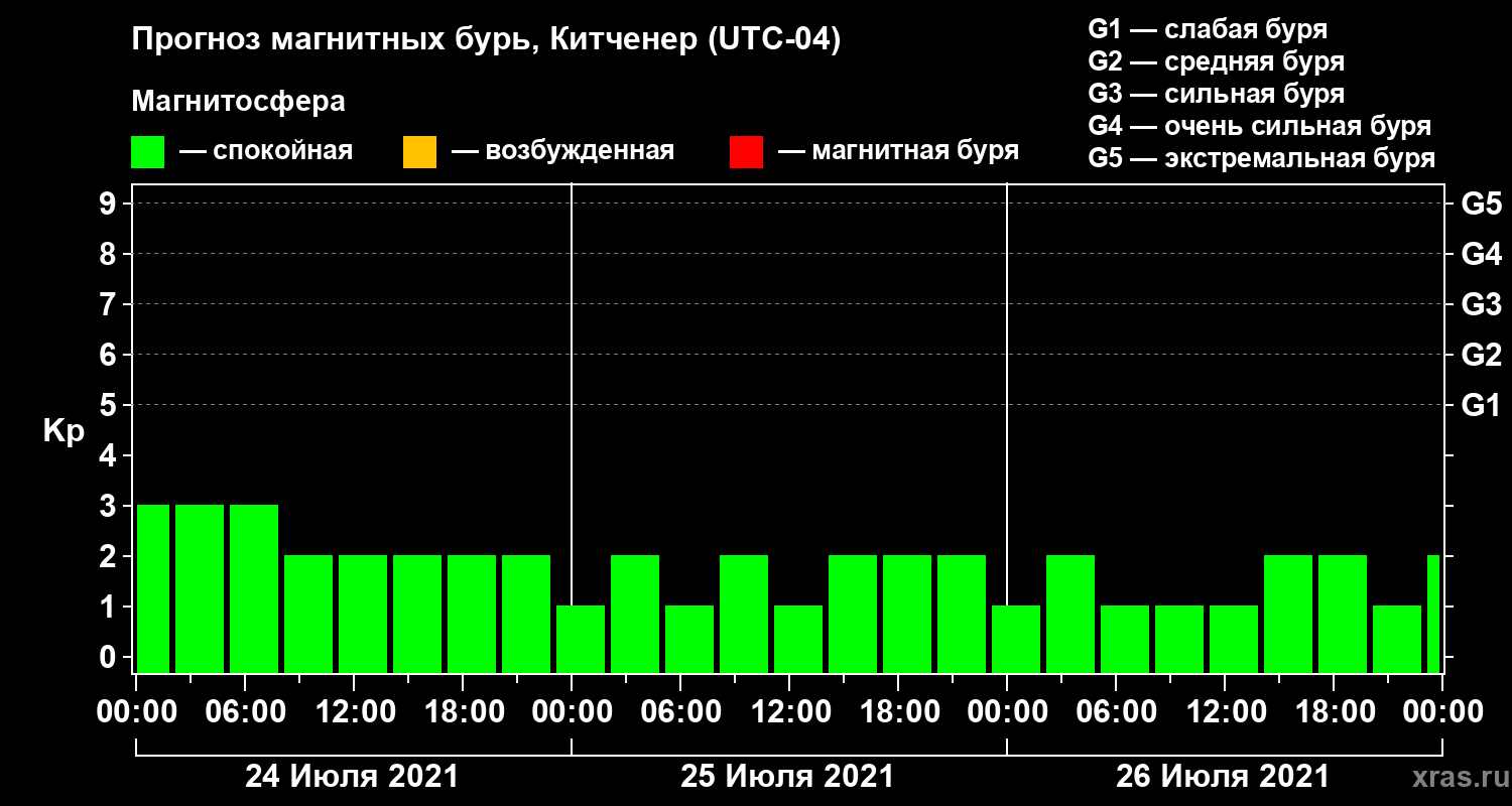 Прогноз магнитных бурь в Китченере на 24 июля 2021 года