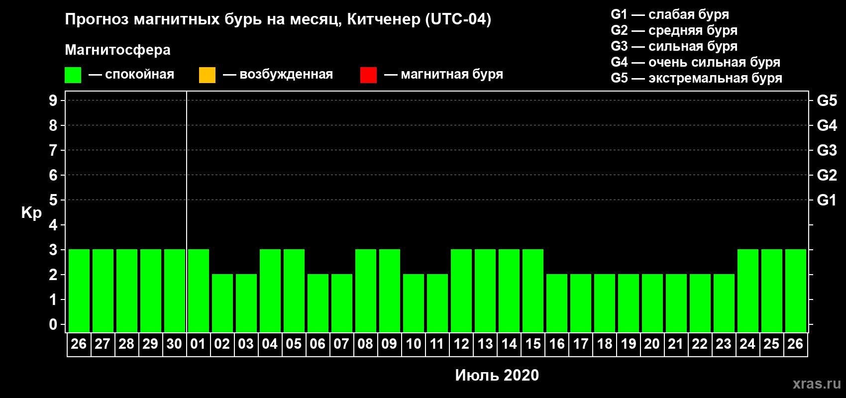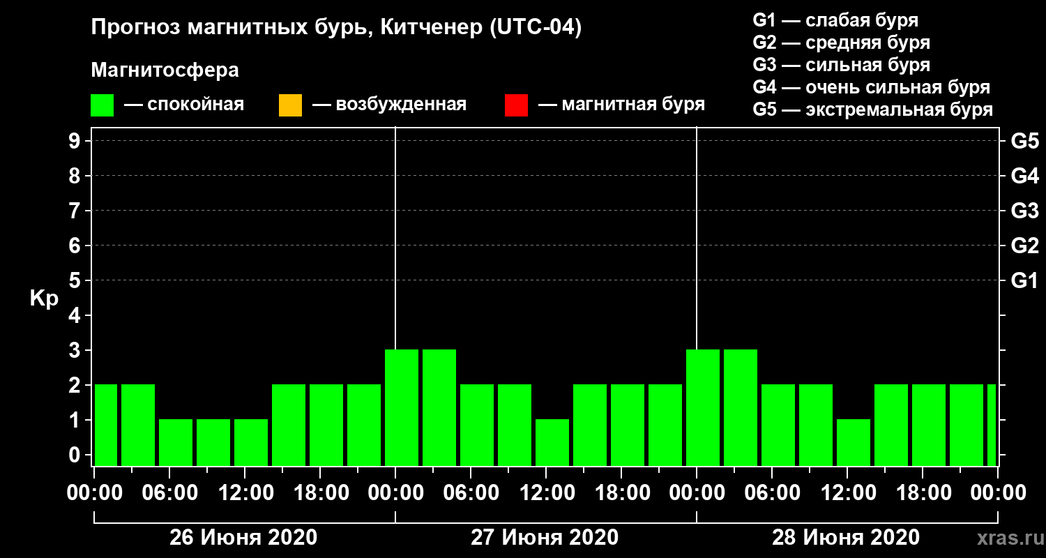 Прогноз магнитных бурь в Китченере на 26 июня 2020 года