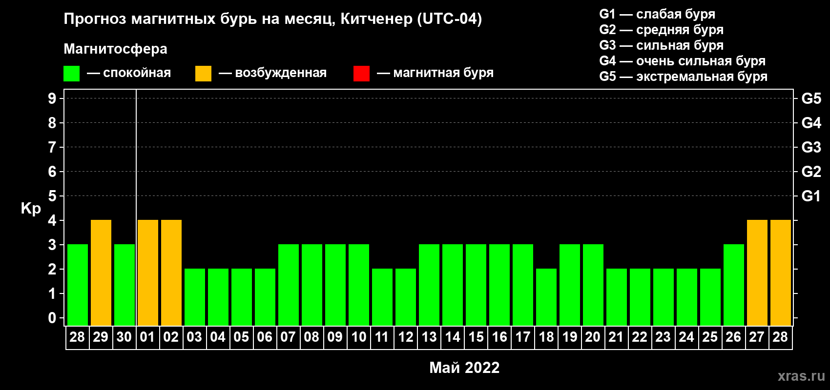 Прогноз магнитных бурь в Китченере на 28 апреля 2022 года