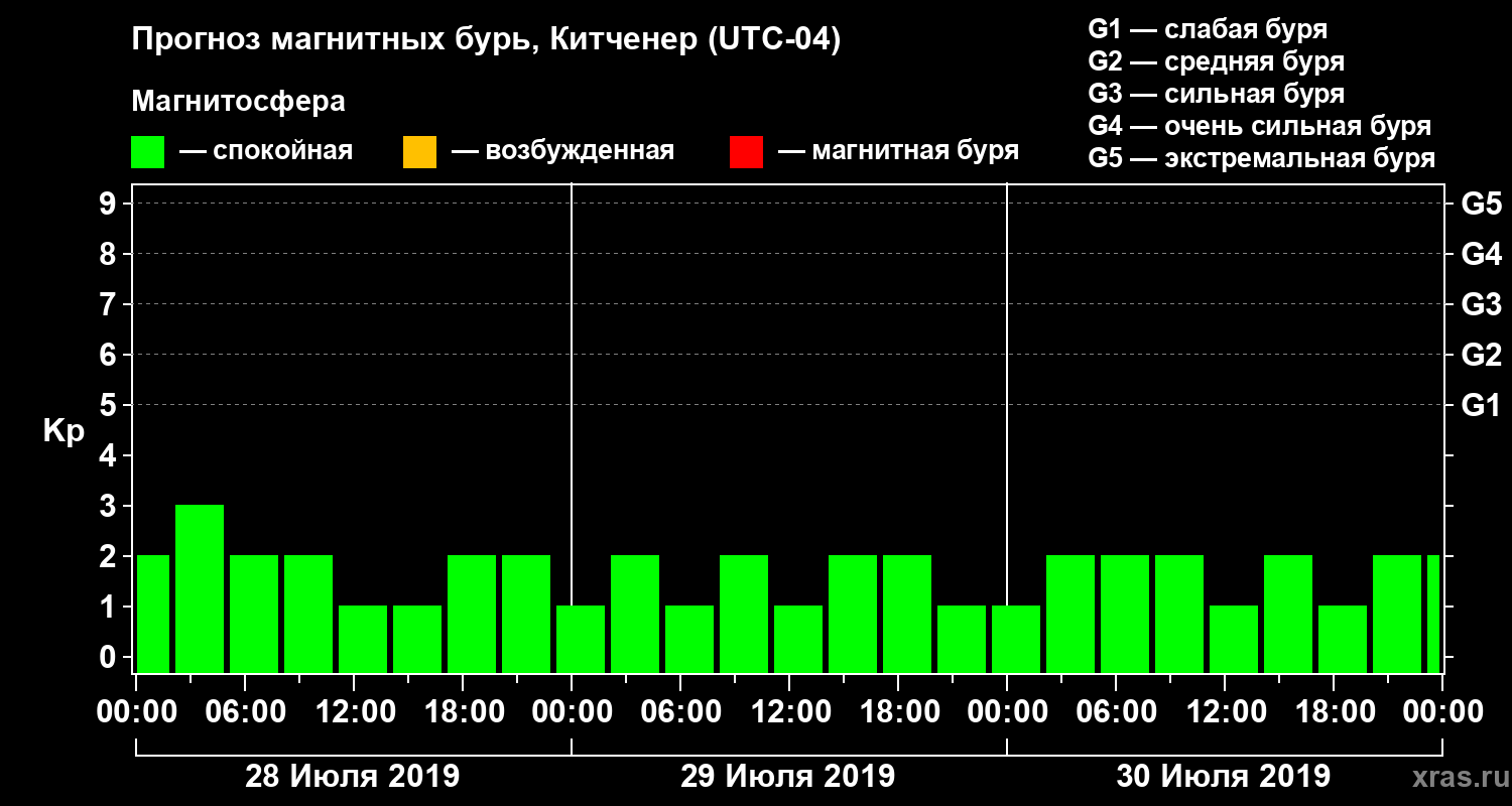 Прогноз магнитных бурь в Китченере на 28 июля 2019 года