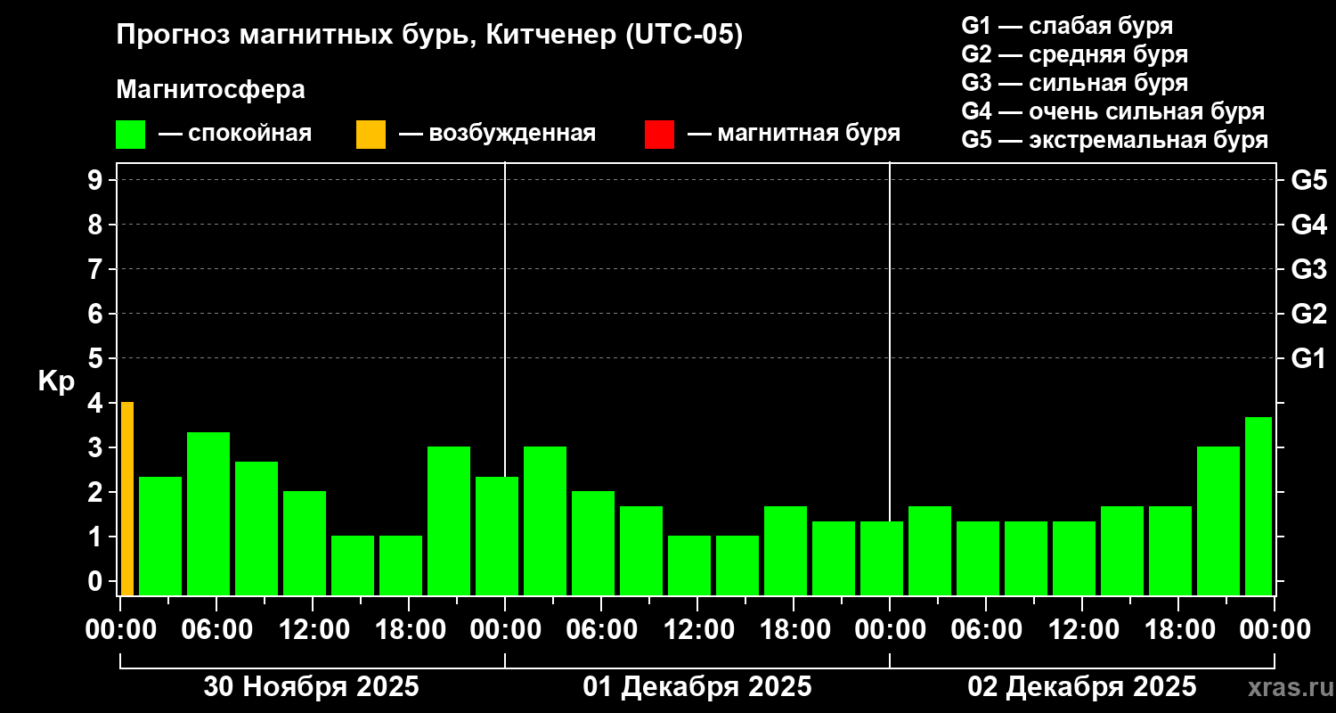 Прогноз магнитных бурь в Китченере — 30 ноября 2025 года