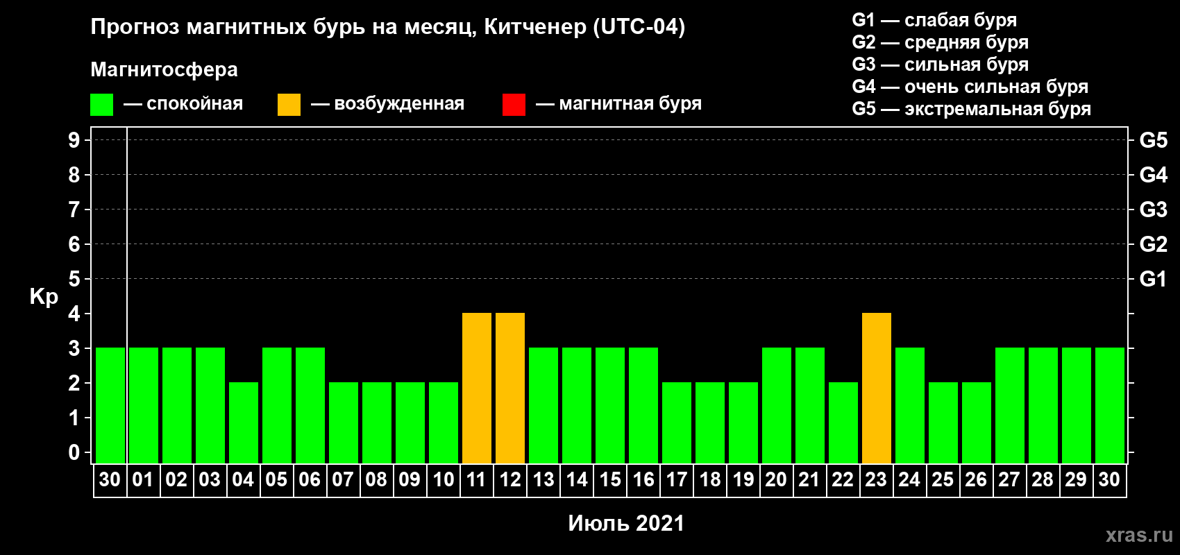 Прогноз магнитных бурь в Китченере на 30 июня 2021 года