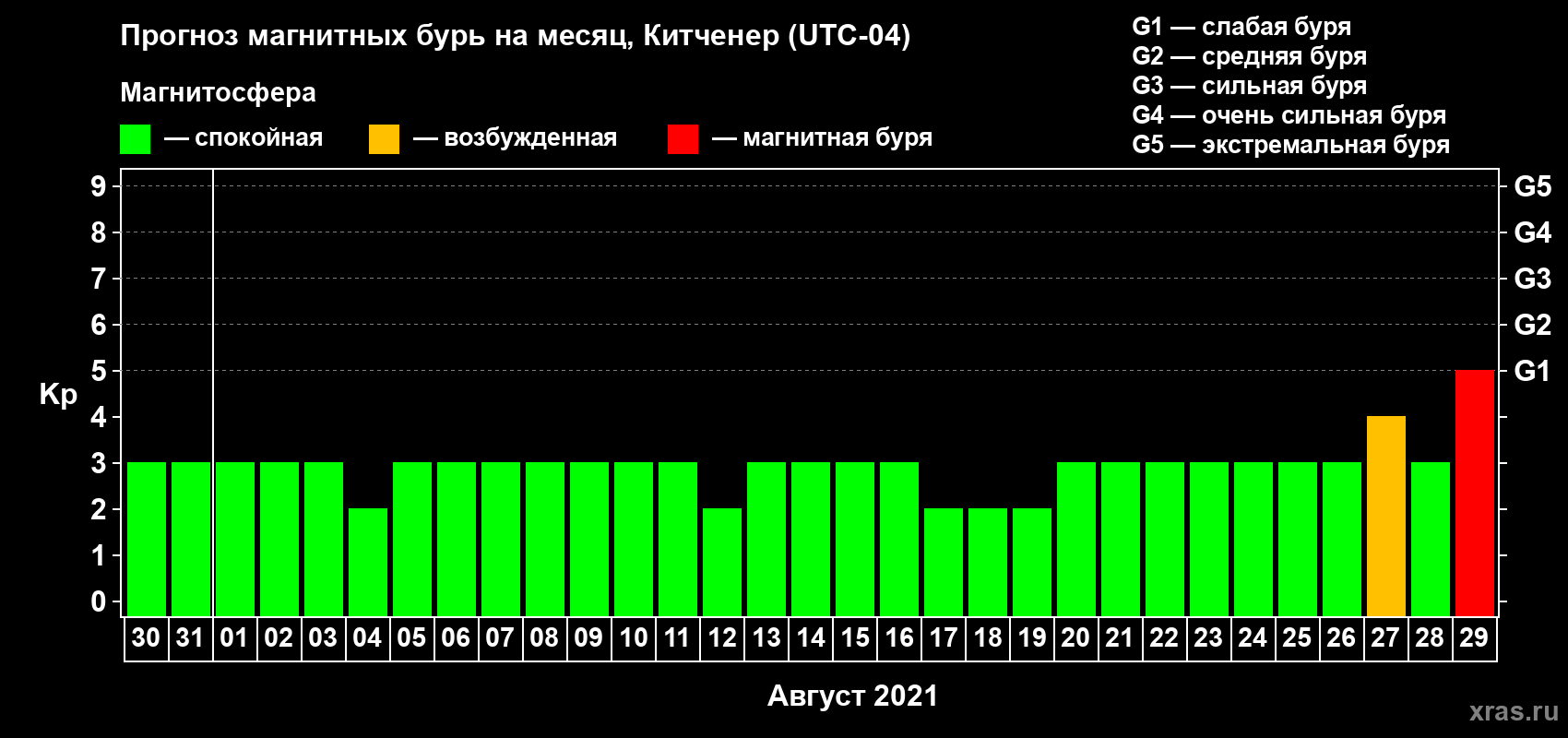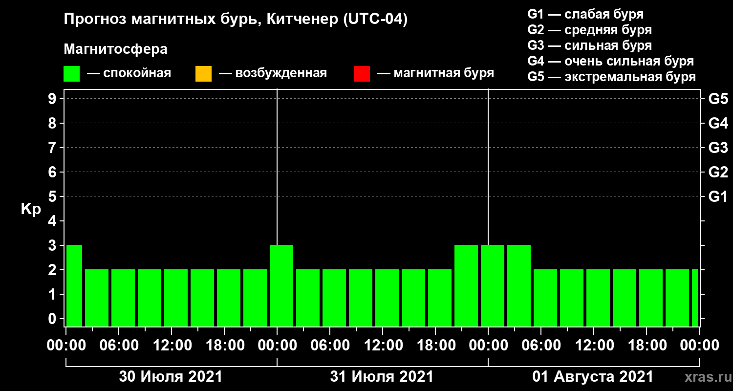 Прогноз магнитных бурь в Китченере на 30 июля 2021 года