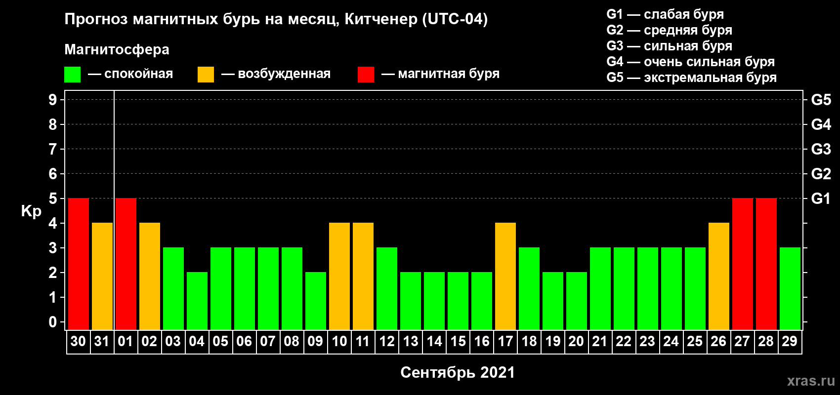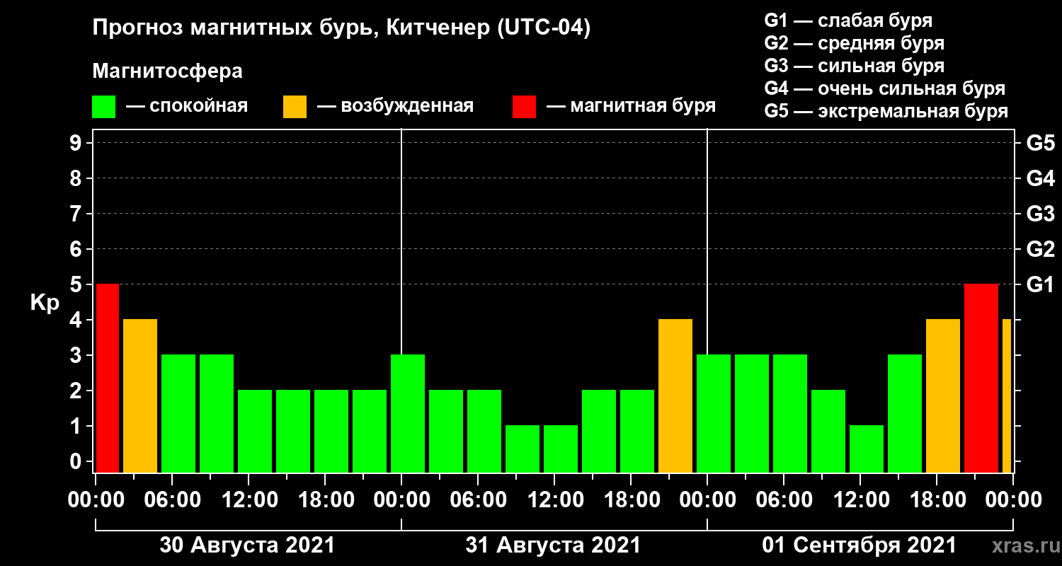 Прогноз магнитных бурь в Китченере на 30 августа 2021 года