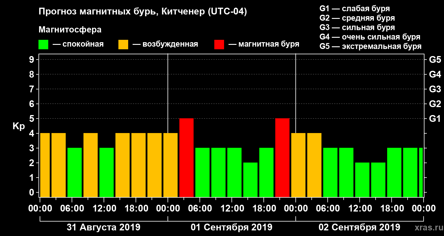 Прогноз магнитных бурь в Китченере на 31 августа 2019 года