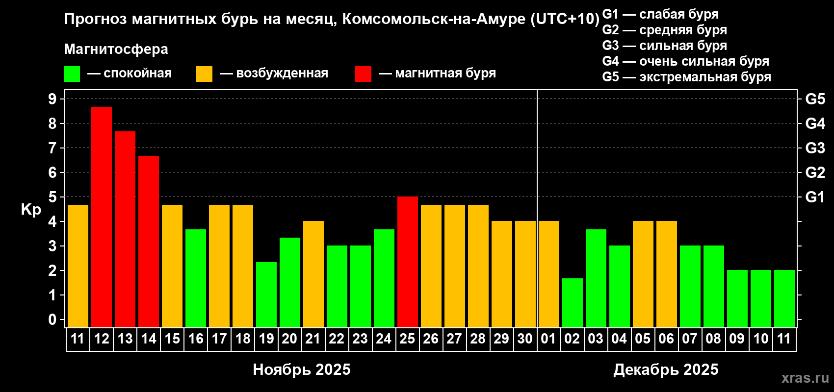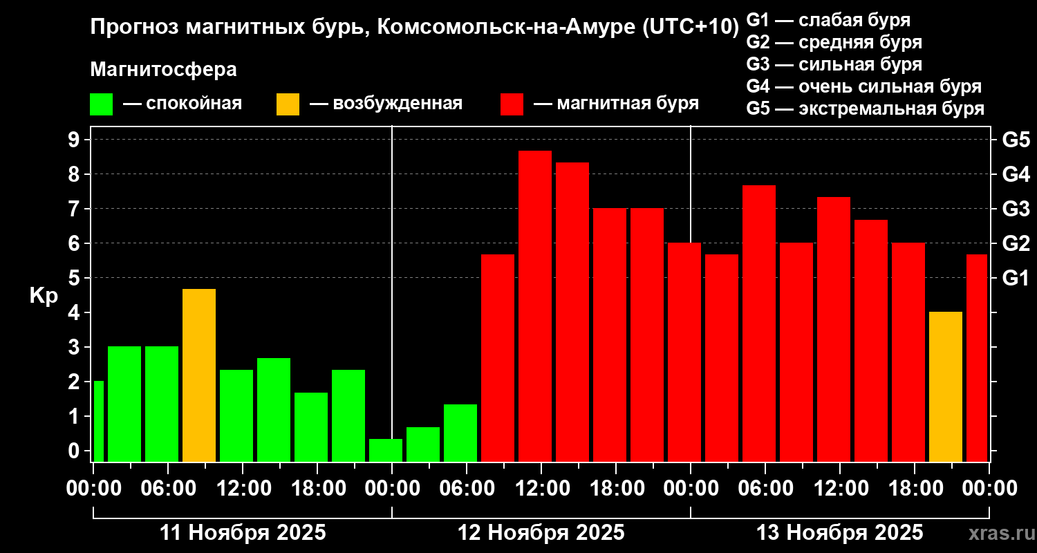 Прогноз магнитных бурь в Комсомольск-на-Амуре — 11 ноября 2025 года