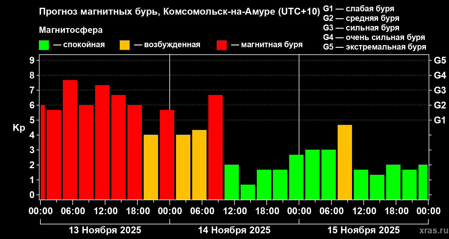 Прогноз магнитных бурь в Комсомольск-на-Амуре — 13 ноября 2025 года
