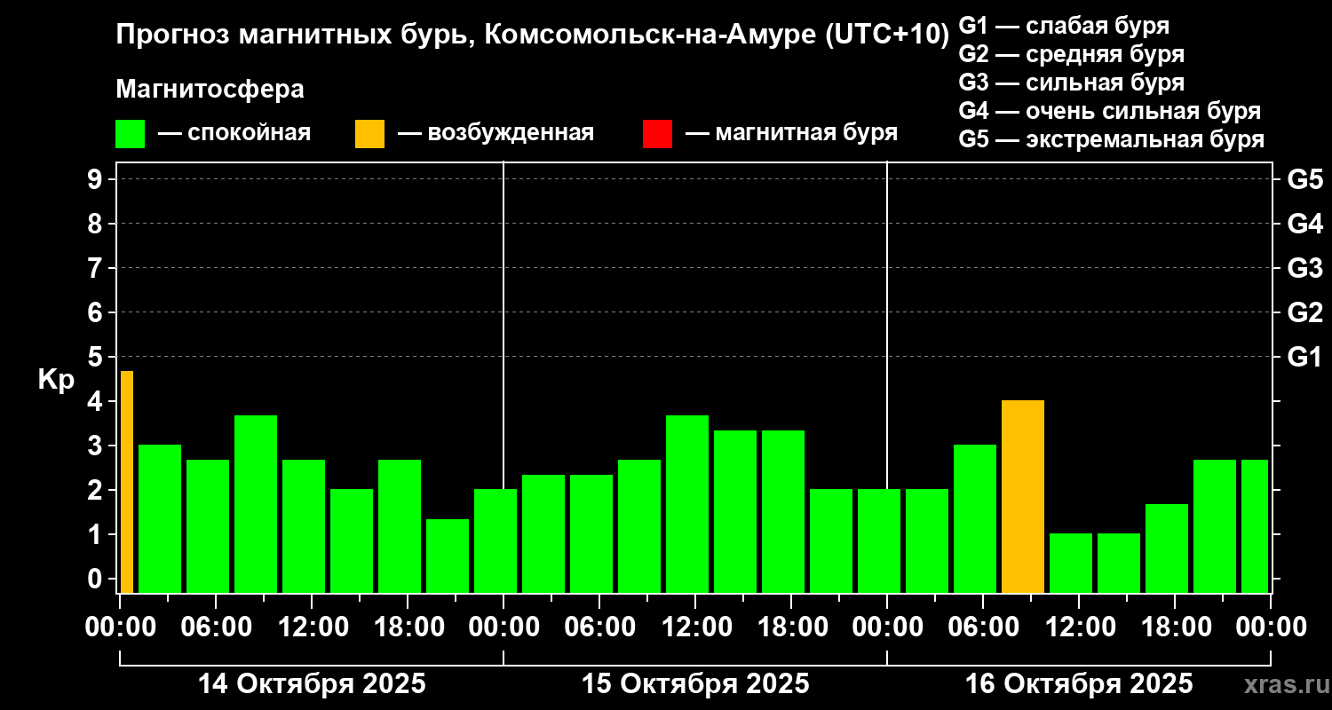 Прогноз магнитных бурь в Комсомольск-на-Амуре — 14 октября 2025 года