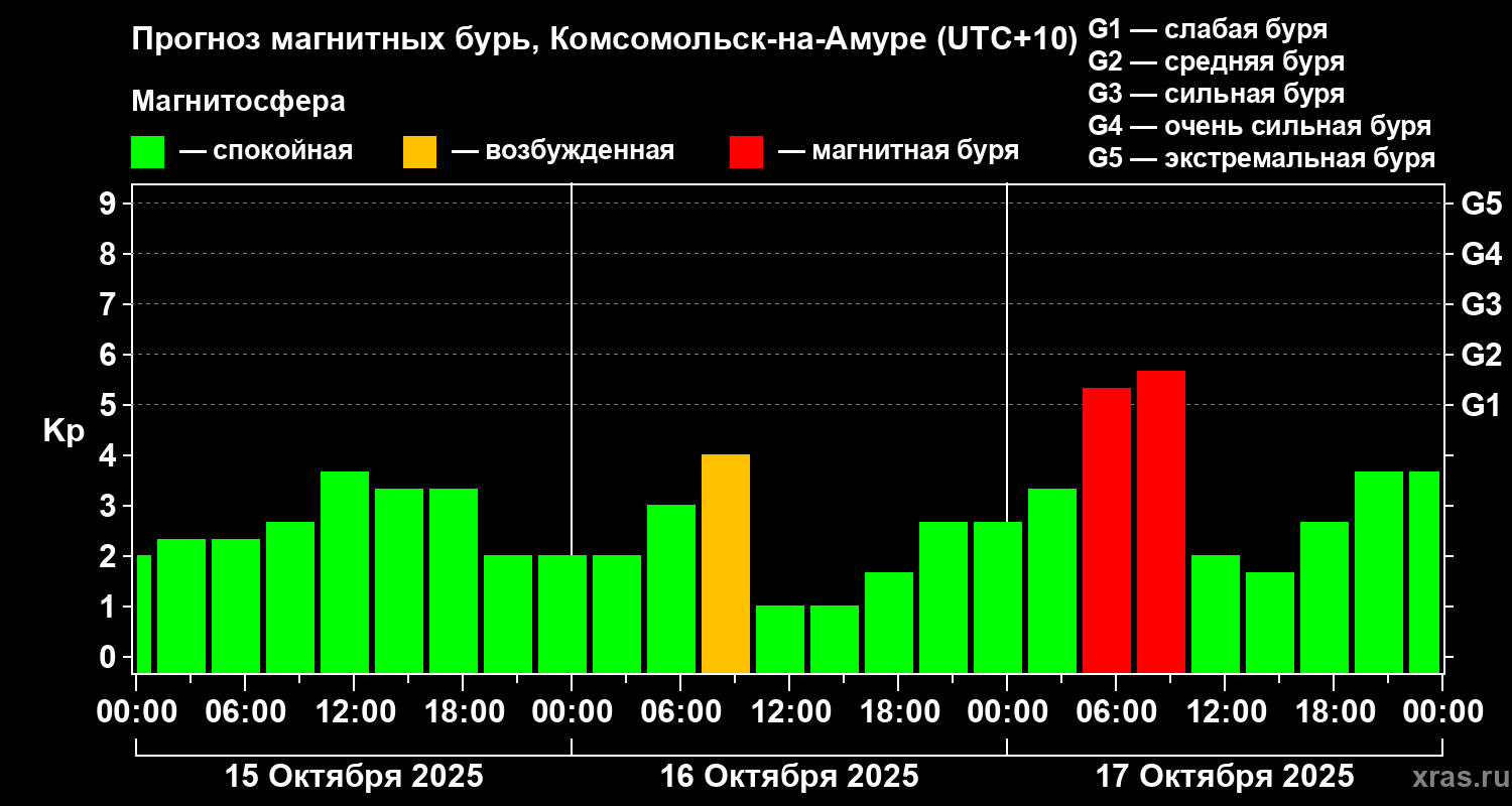 Прогноз магнитных бурь в Комсомольск-на-Амуре — 15 октября 2025 года