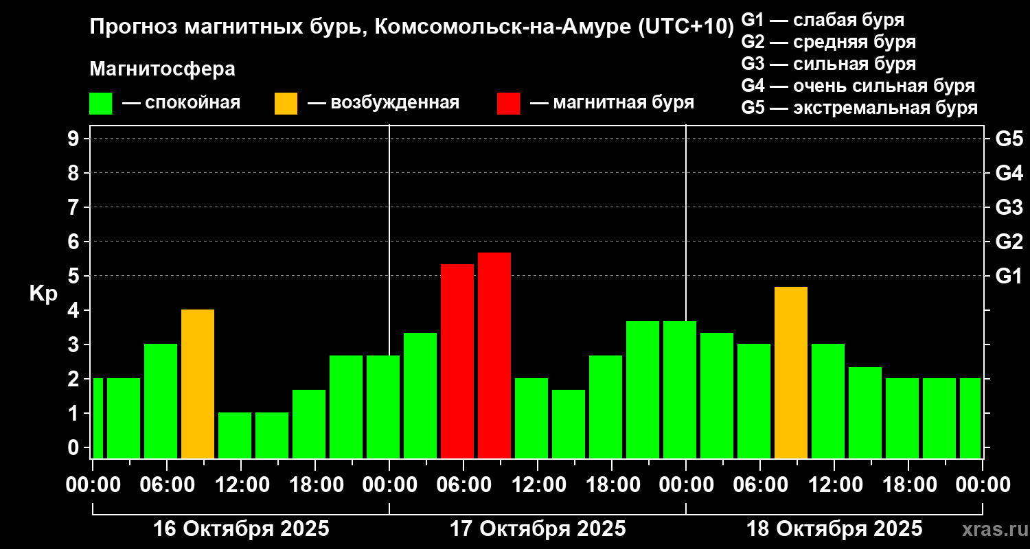 Прогноз магнитных бурь в Комсомольск-на-Амуре — 16 октября 2025 года