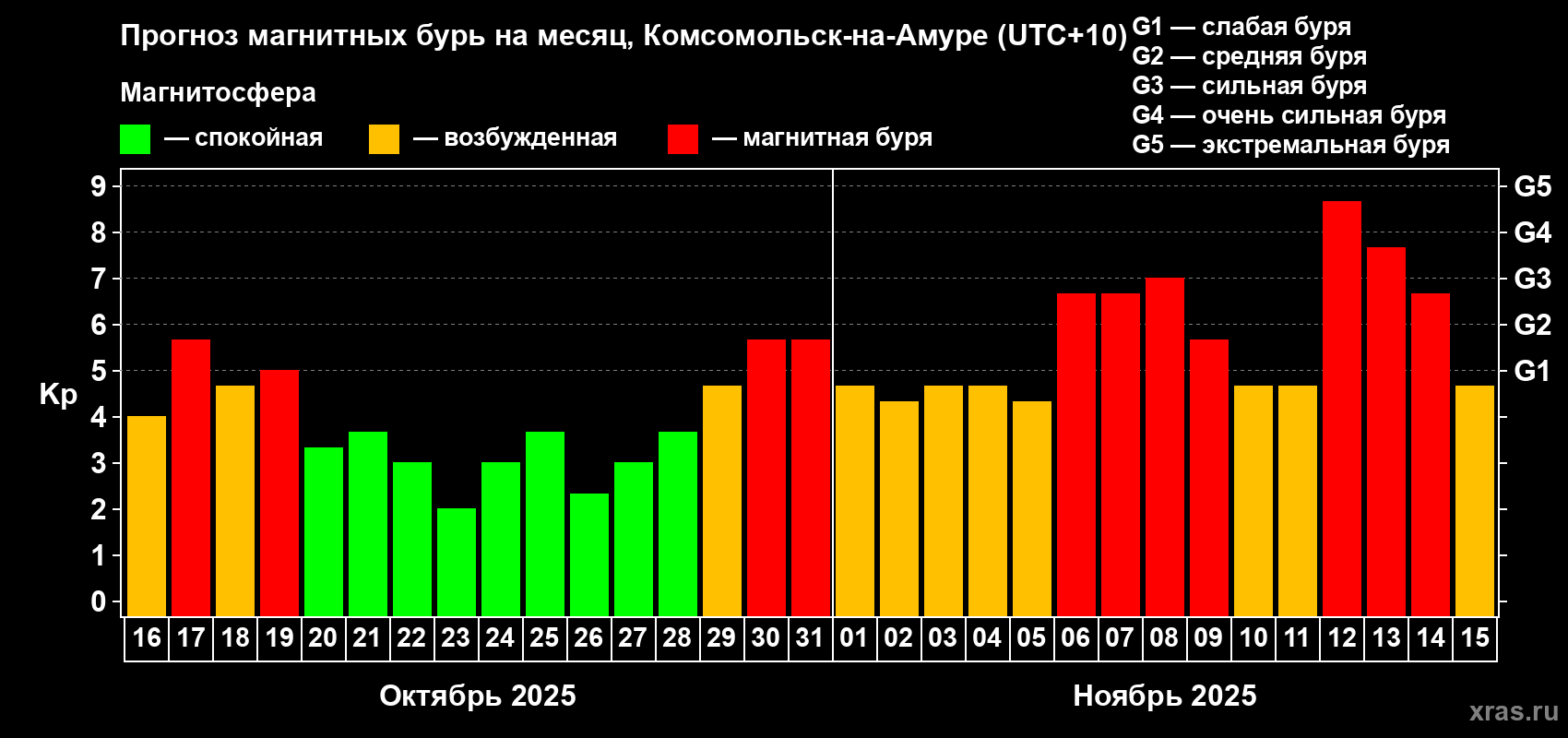 Прогноз магнитных бурь в Комсомольск-на-Амуре на 16 октября 2025 года