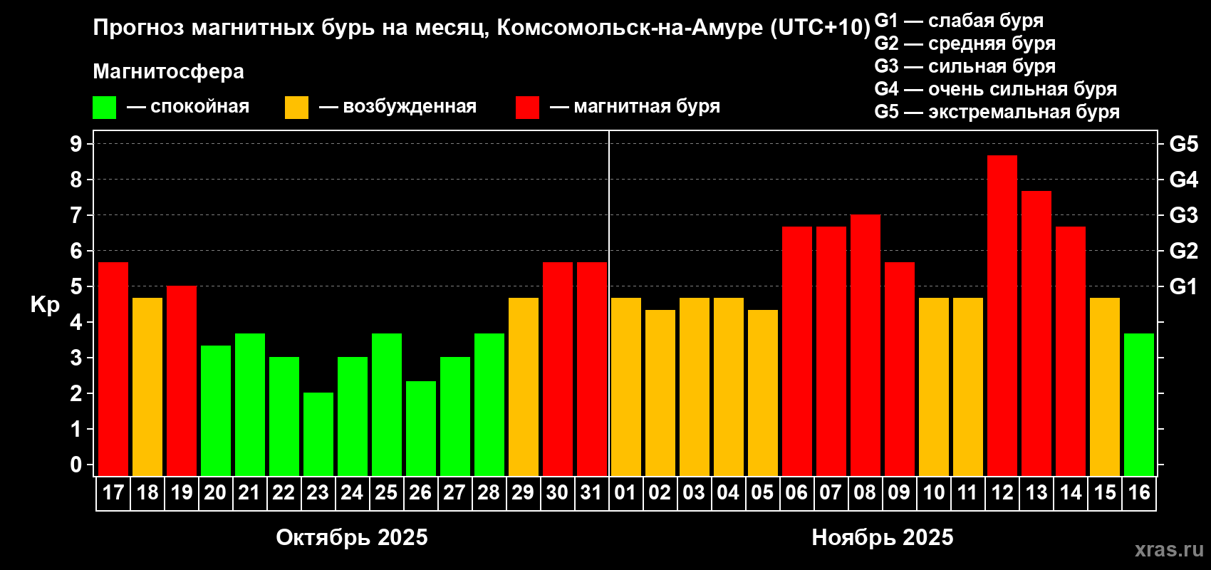 Прогноз магнитных бурь в Комсомольск-на-Амуре — 17 октября 2025 года