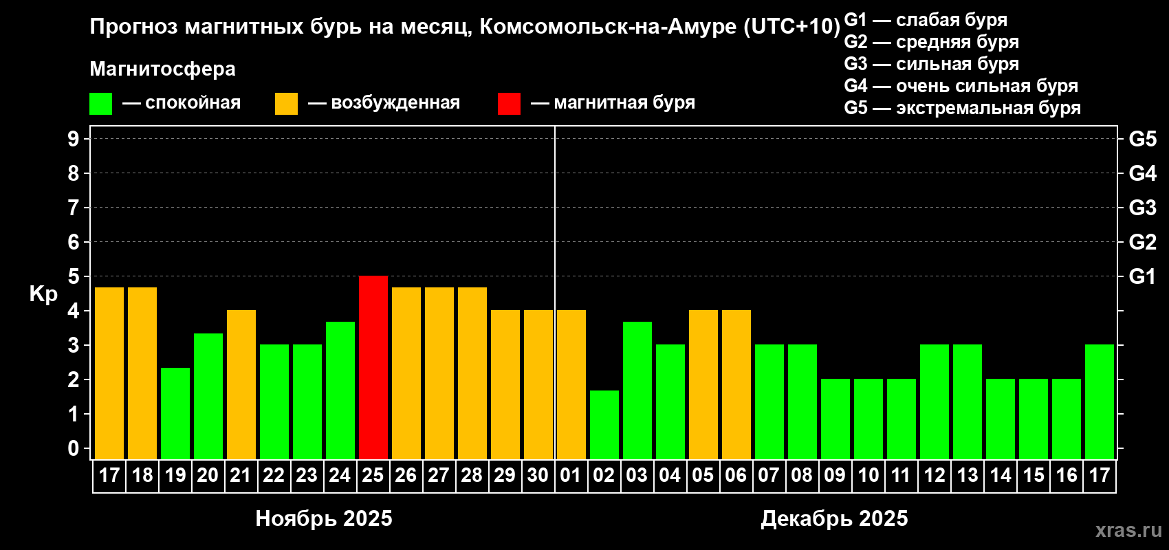 Прогноз магнитных бурь в Комсомольск-на-Амуре — 17 ноября 2025 года
