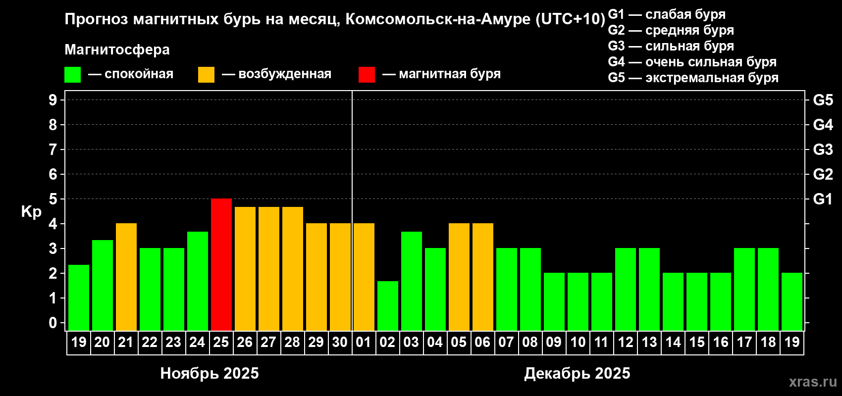 Прогноз магнитных бурь в Комсомольск-на-Амуре — 19 ноября 2025 года