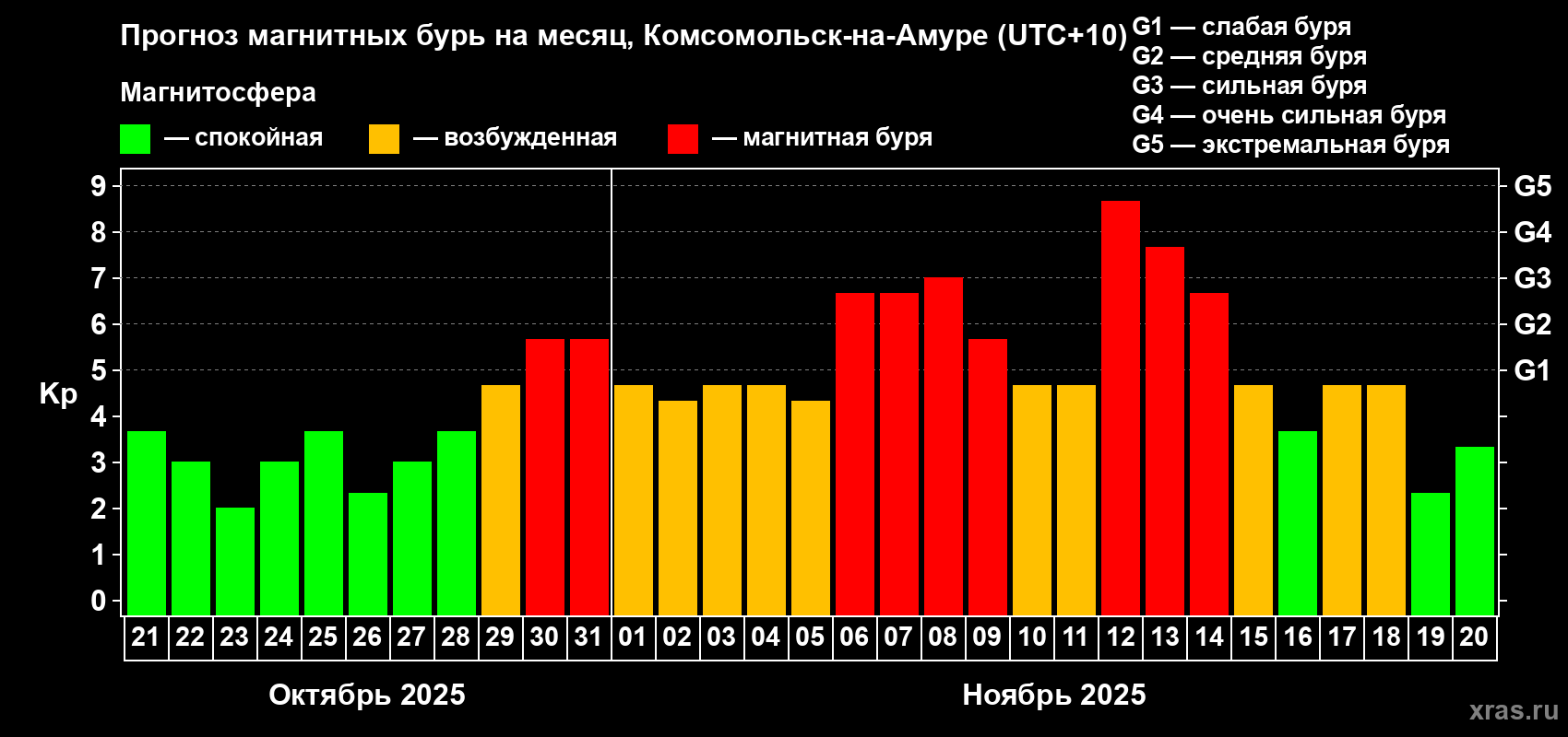 Прогноз магнитных бурь в Комсомольск-на-Амуре — 21 октября 2025 года