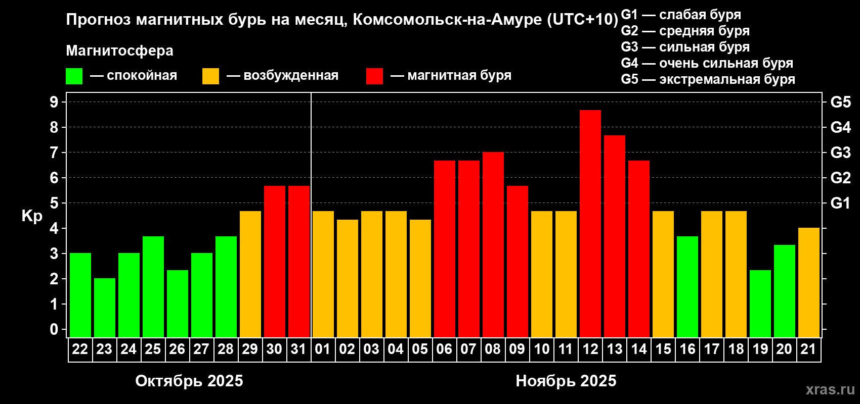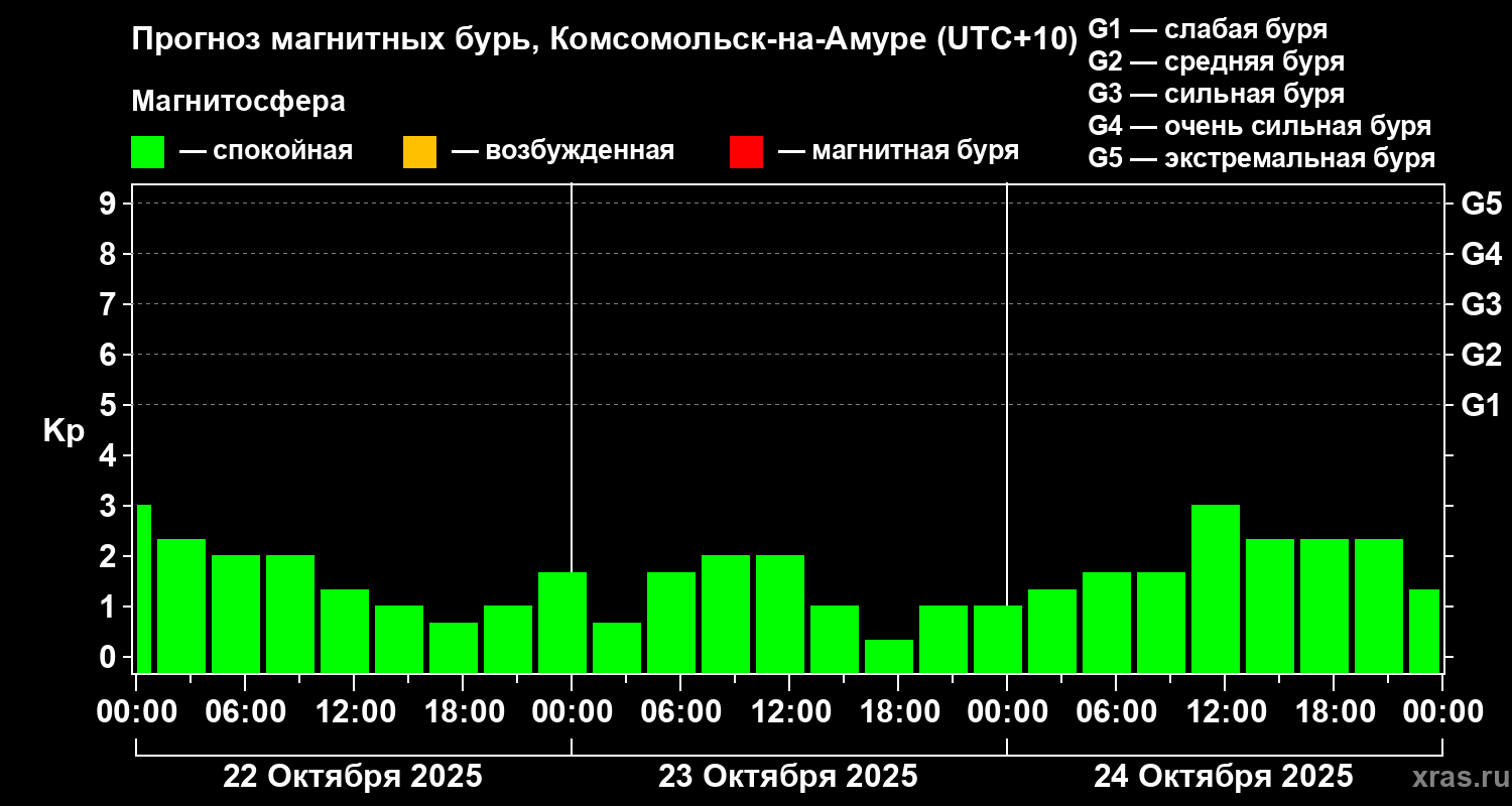Прогноз магнитных бурь в Комсомольск-на-Амуре — 22 октября 2025 года