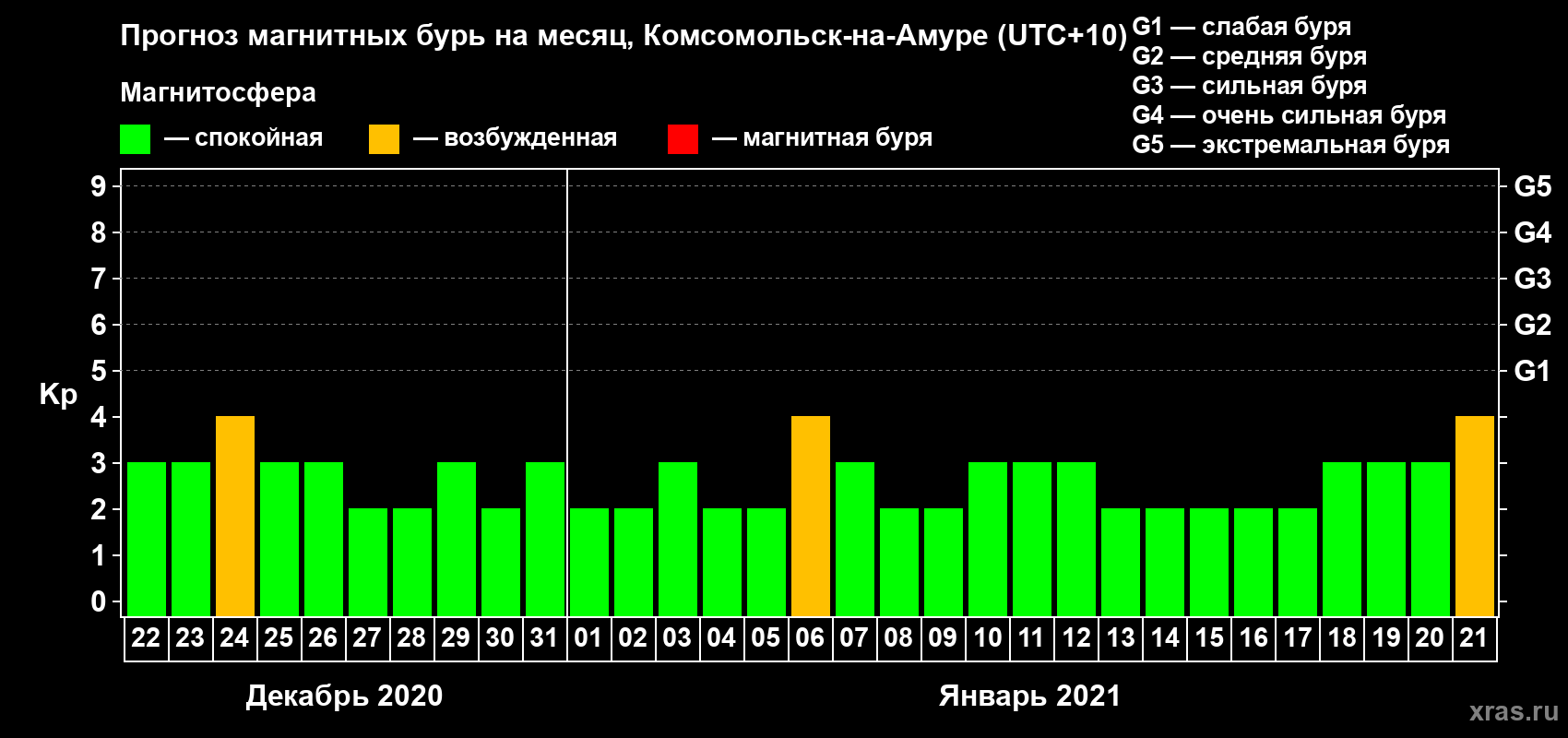 Прогноз магнитных бурь в Комсомольск-на-Амуре — 22 декабря 2020 года