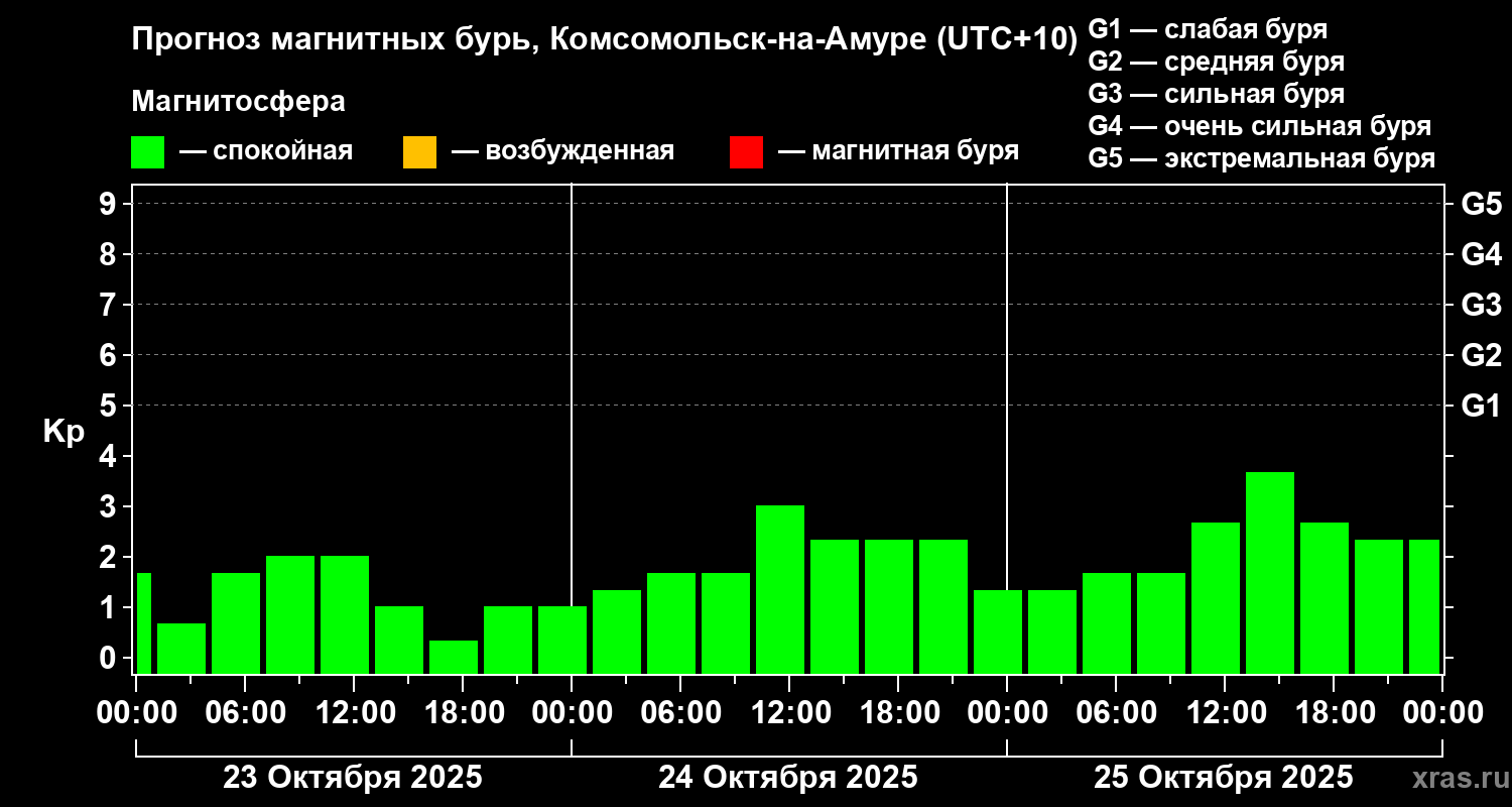 Прогноз магнитных бурь в Комсомольск-на-Амуре на 23 октября 2025 года