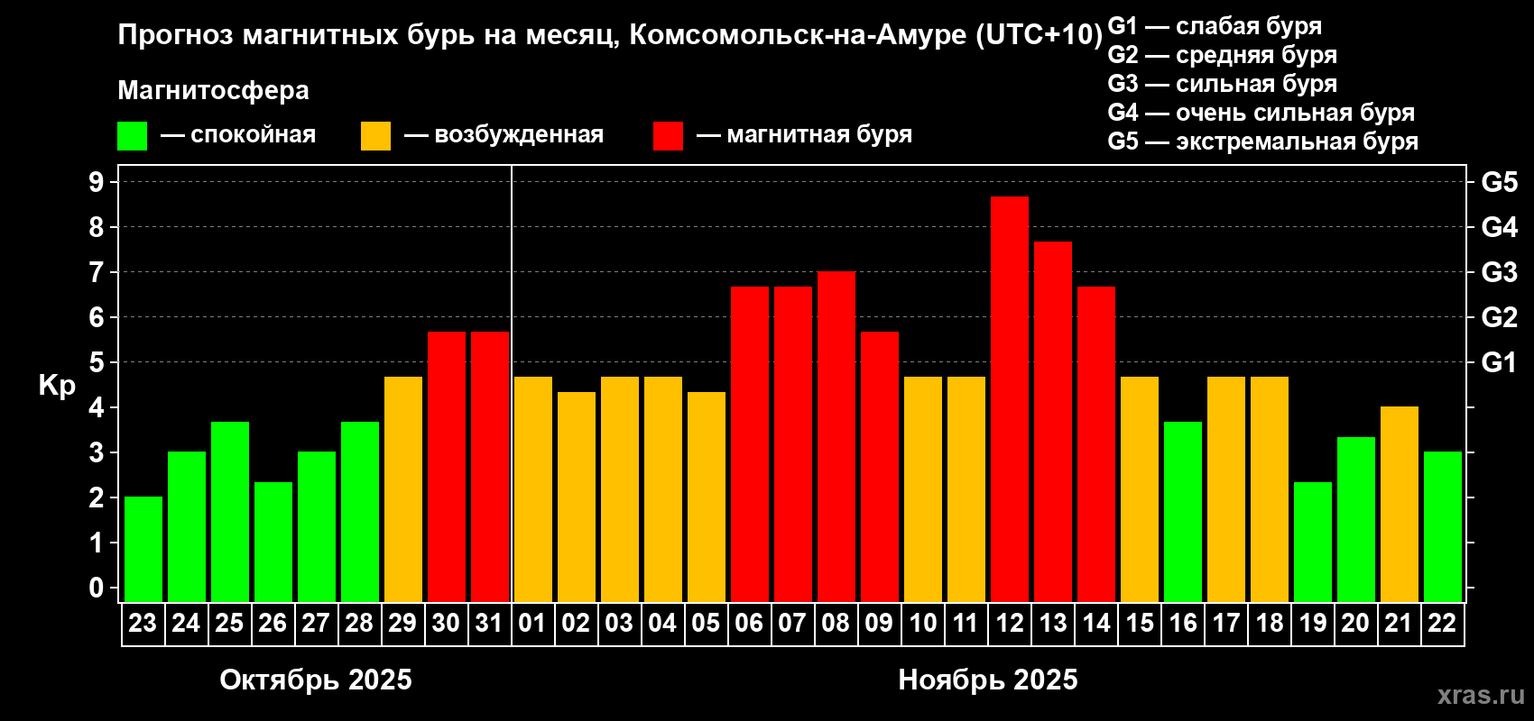 Прогноз магнитных бурь в Комсомольск-на-Амуре — 23 октября 2025 года