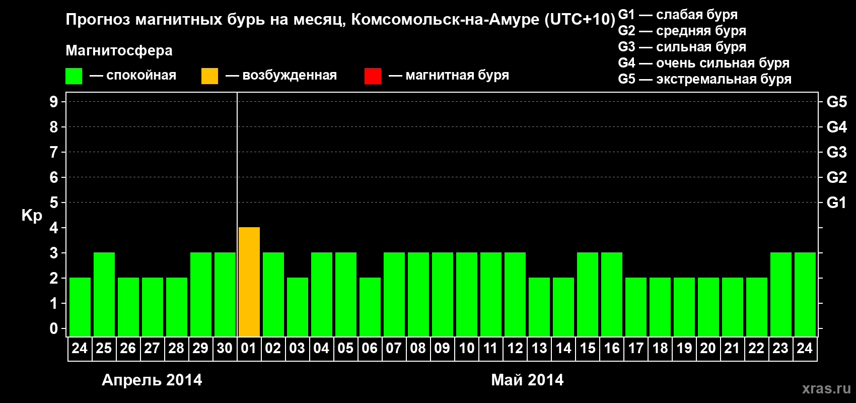 Прогноз магнитных бурь в Комсомольск-на-Амуре — 24 апреля 2014 года