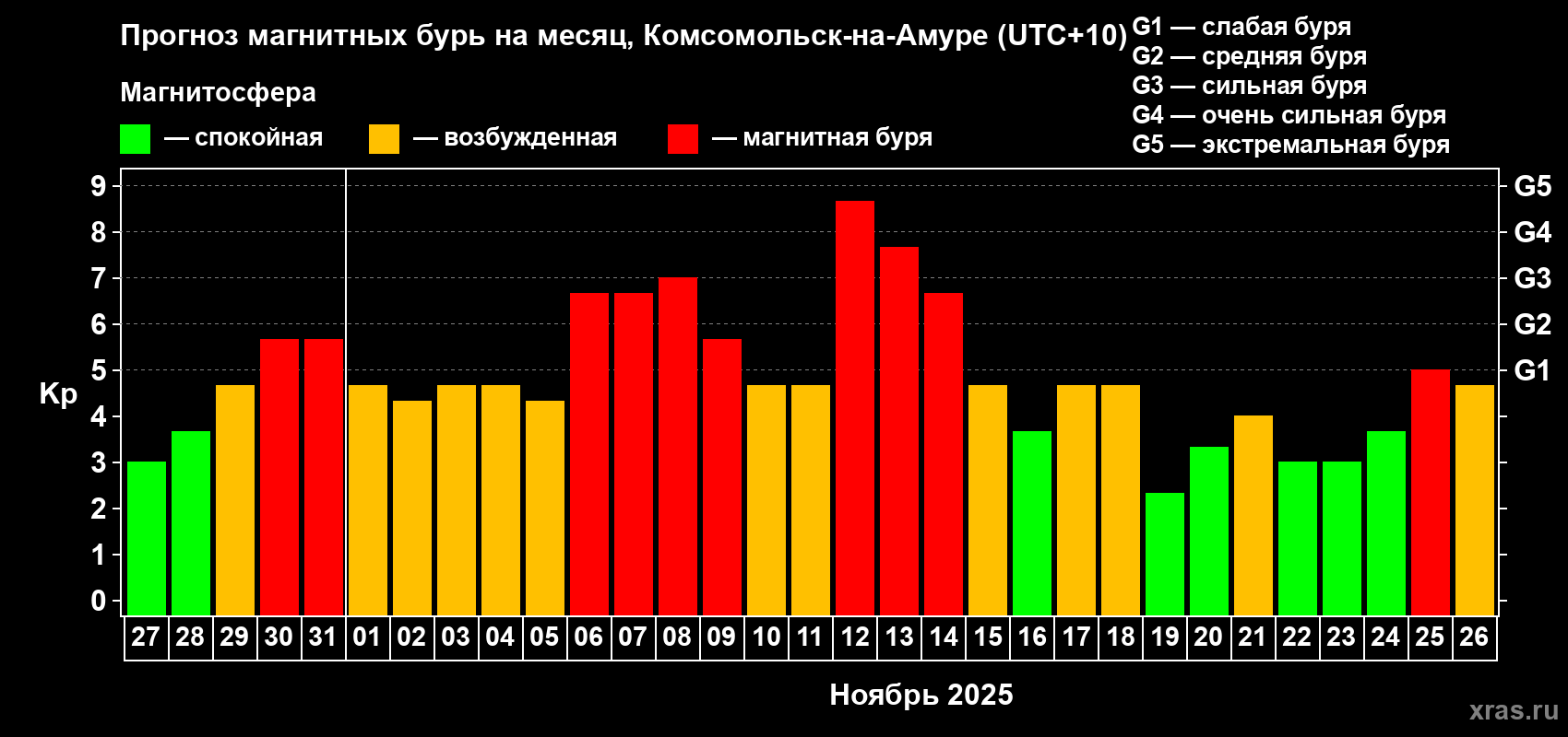Прогноз магнитных бурь в Комсомольск-на-Амуре — 27 октября 2025 года