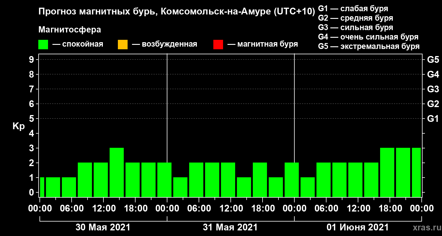 Прогноз магнитных бурь в Комсомольск-на-Амуре на 30 мая 2021 года