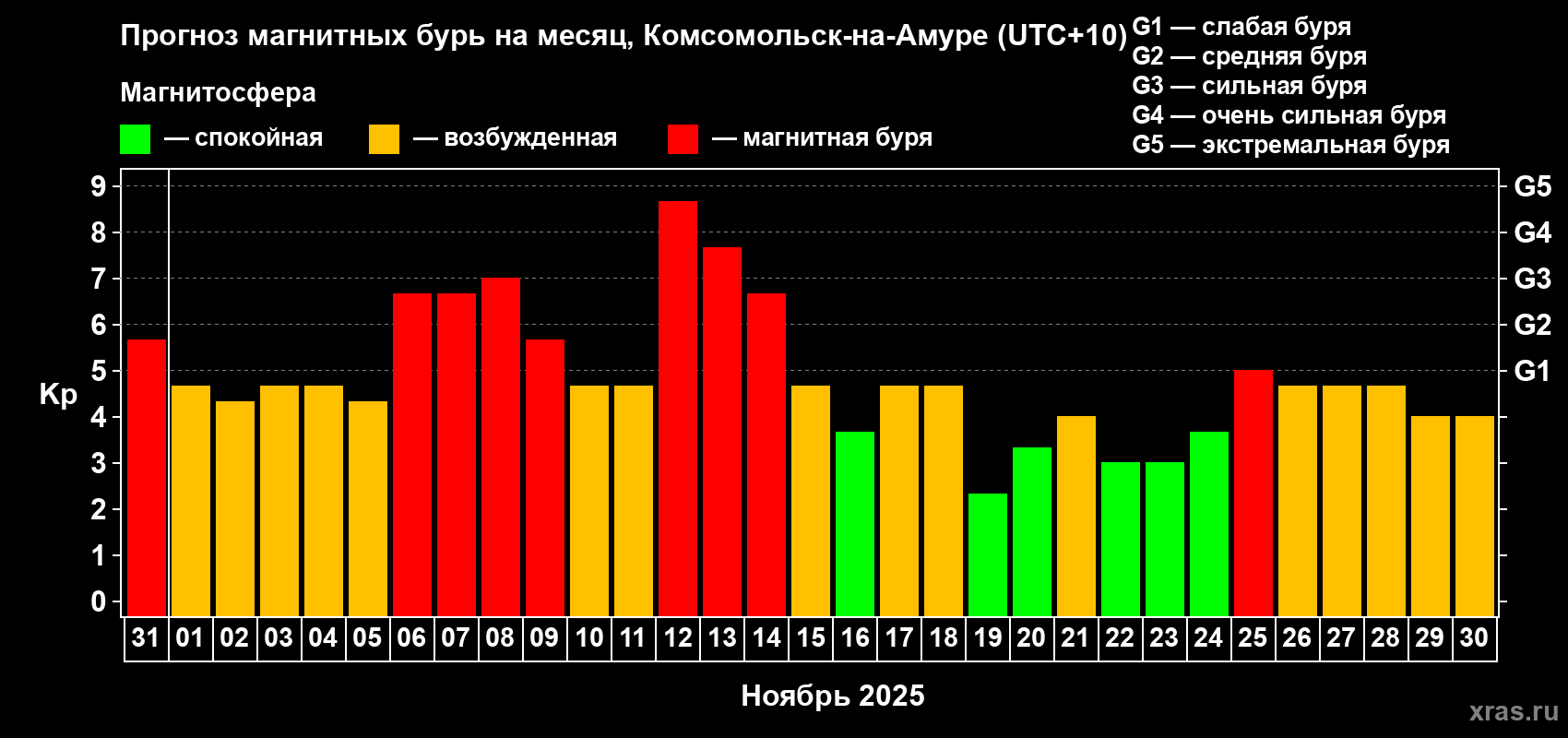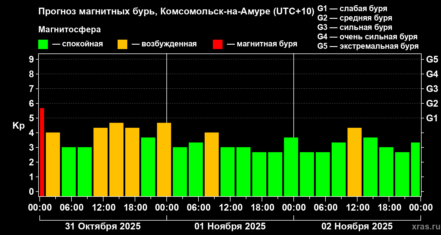 Прогноз магнитных бурь в Комсомольск-на-Амуре — 31 октября 2025 года