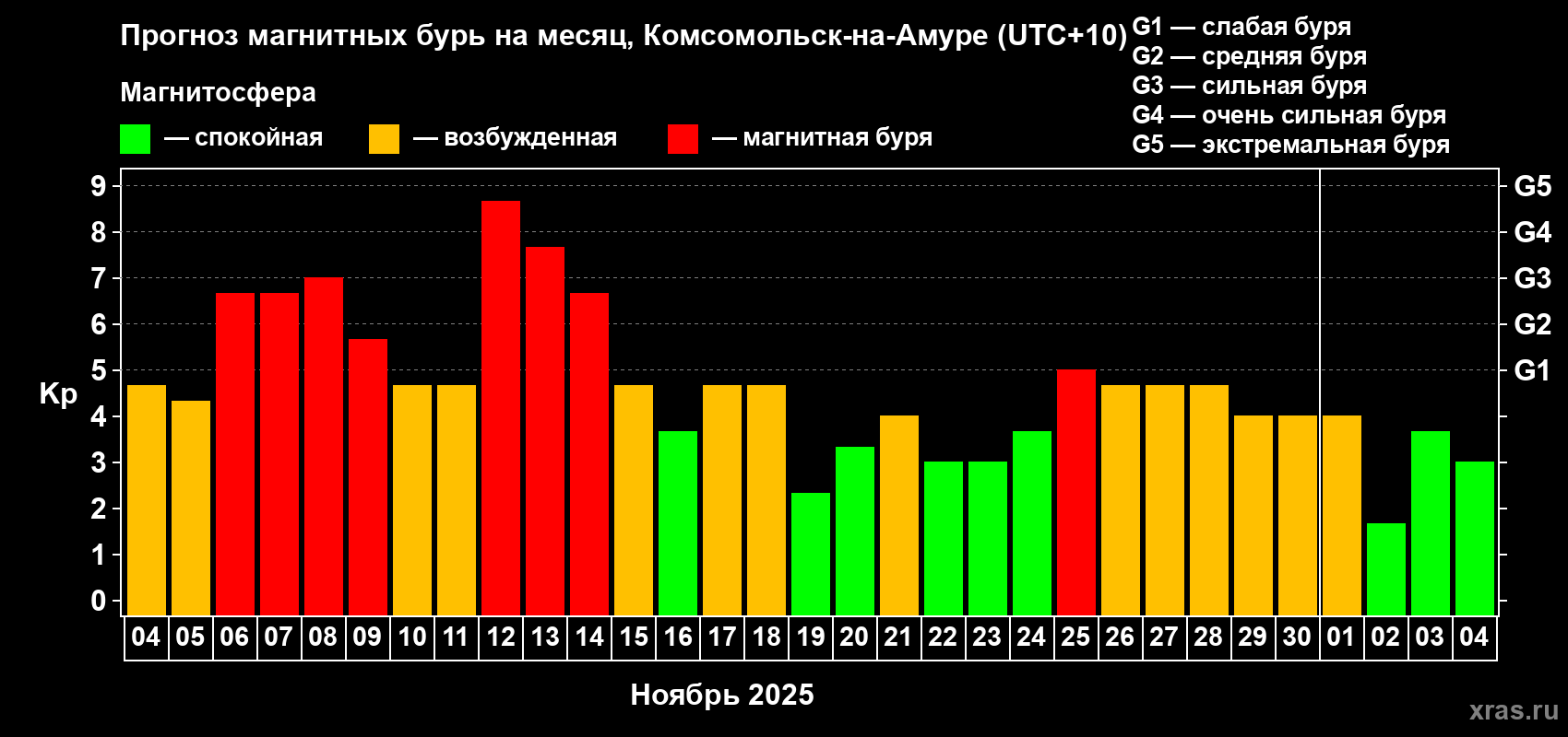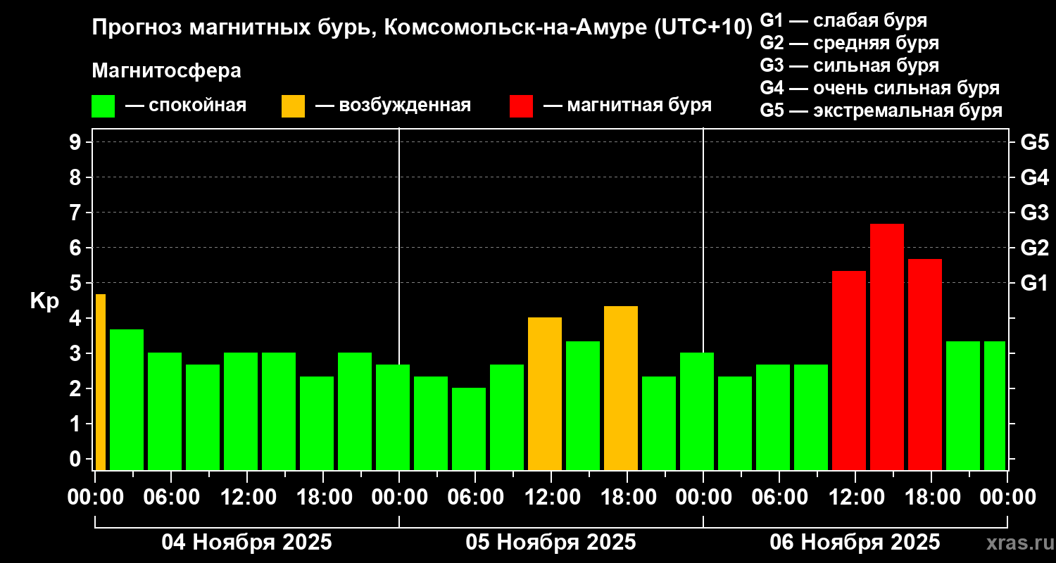 Прогноз магнитных бурь в Комсомольск-на-Амуре — 4 ноября 2025 года