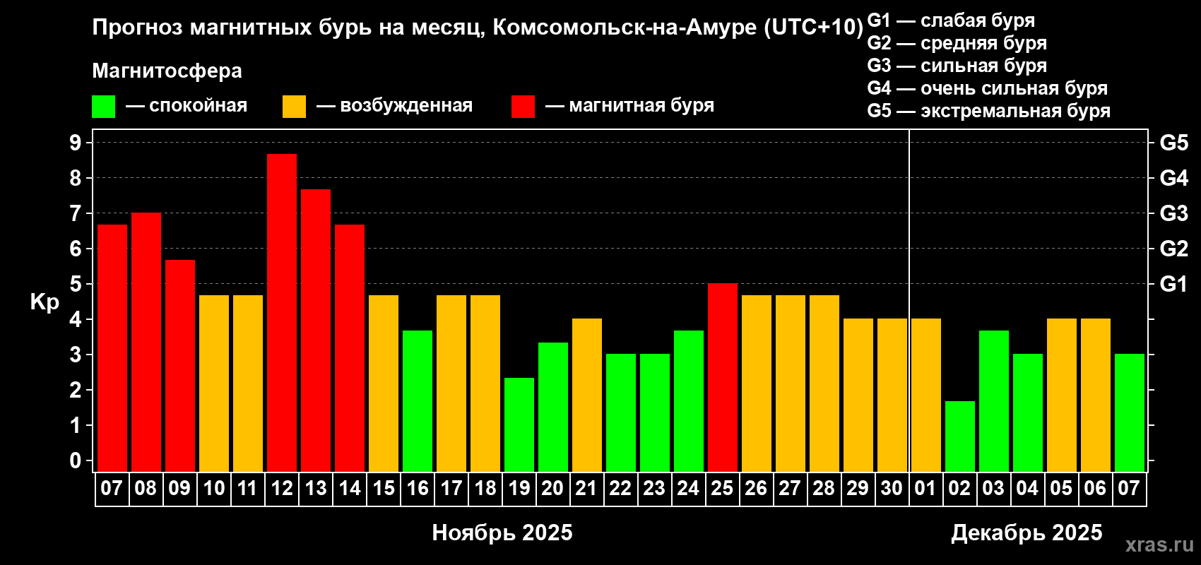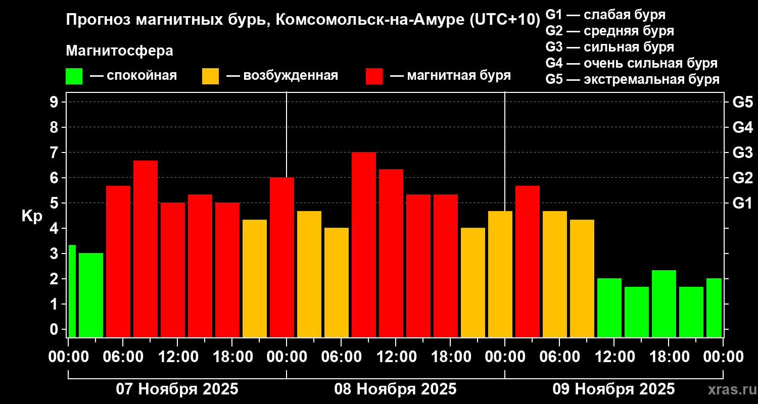 Прогноз магнитных бурь в Комсомольск-на-Амуре — 7 ноября 2025 года
