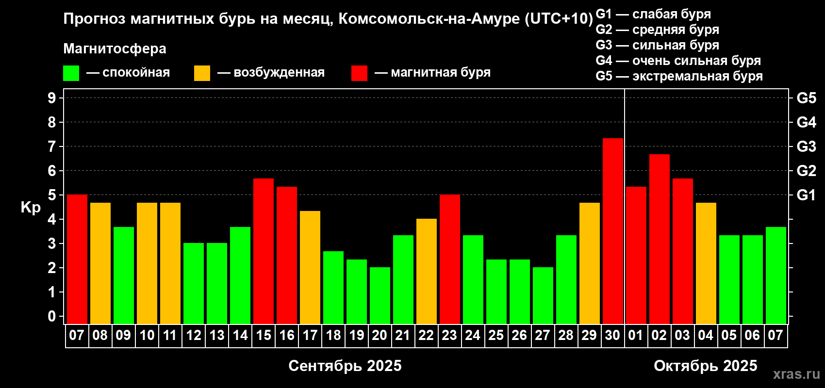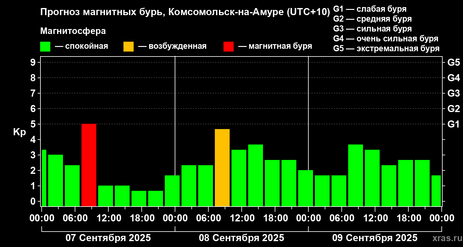 Прогноз магнитных бурь в Комсомольск-на-Амуре — 7 сентября 2025 года