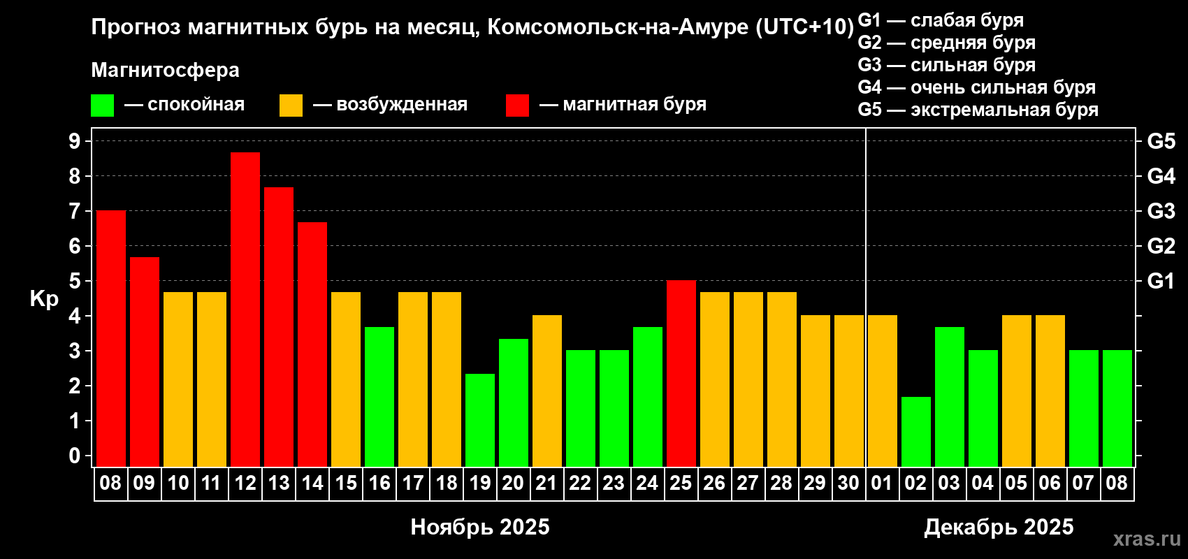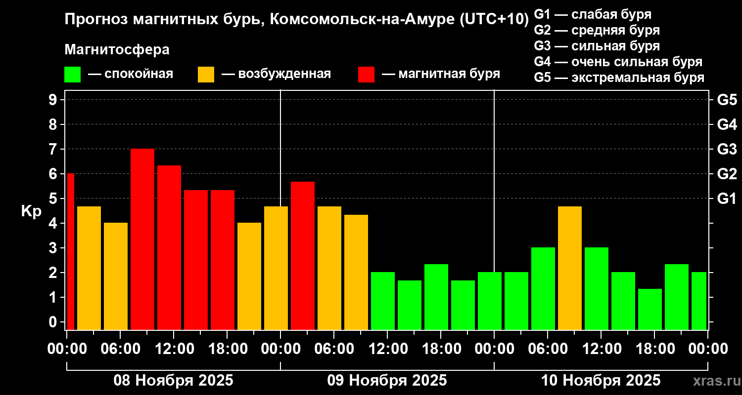 Прогноз магнитных бурь в Комсомольск-на-Амуре — 8 ноября 2025 года