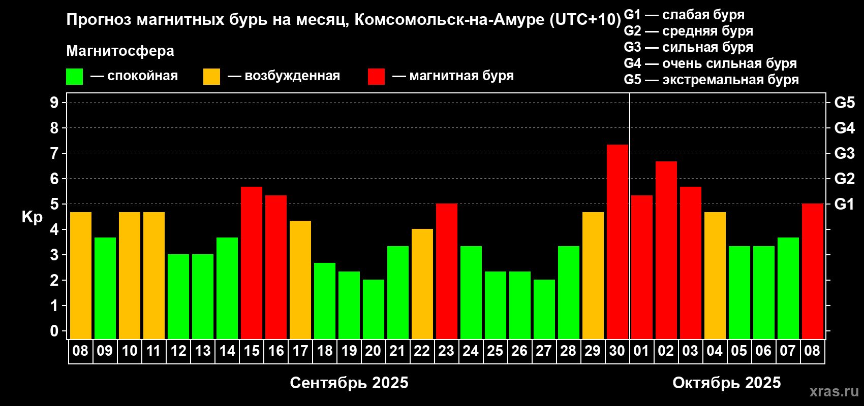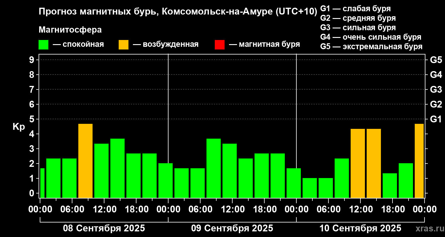 Прогноз магнитных бурь в Комсомольск-на-Амуре — 8 сентября 2025 года
