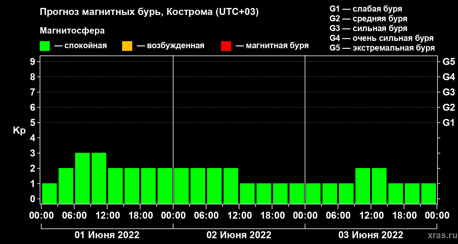 Прогноз магнитных бурь в Костроме на 1 июня 2022 года