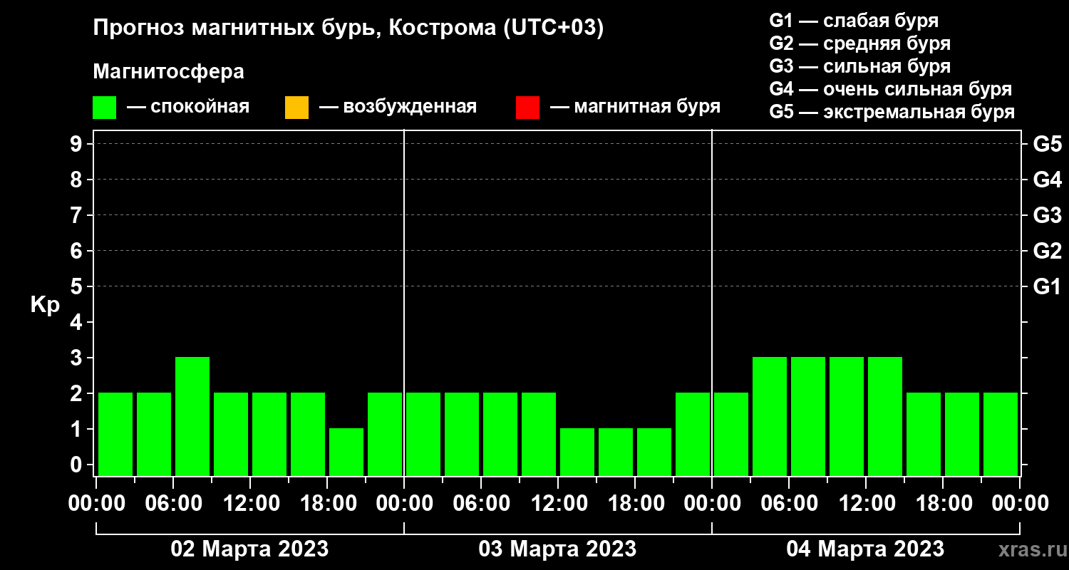 Прогноз магнитных бурь в Костроме — 2 марта 2023 года