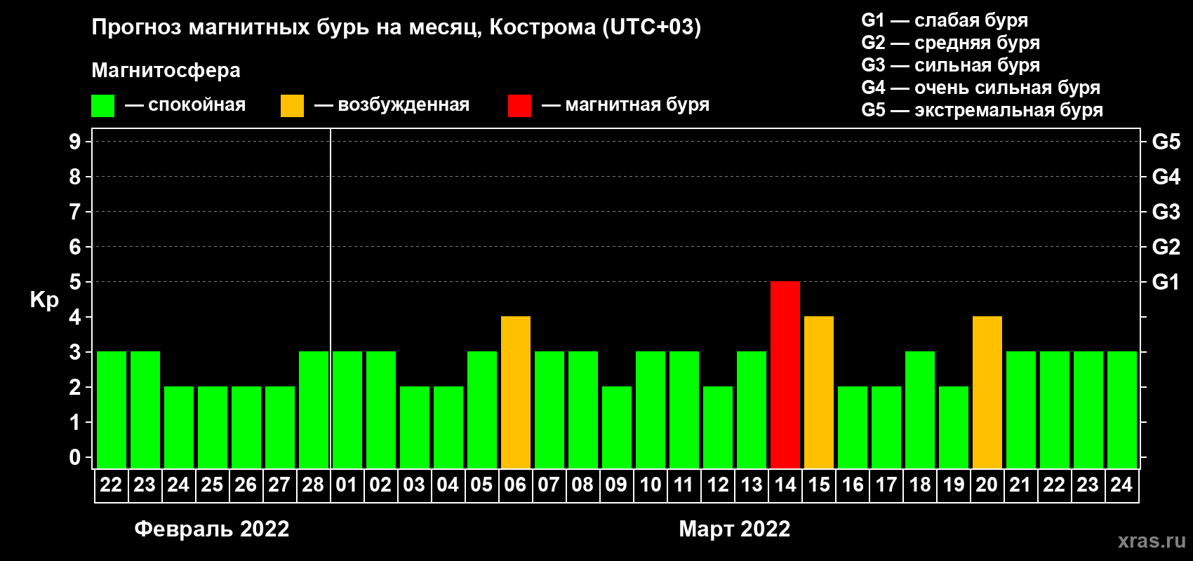 Прогноз магнитных бурь в Костроме — 22 февраля 2022 года