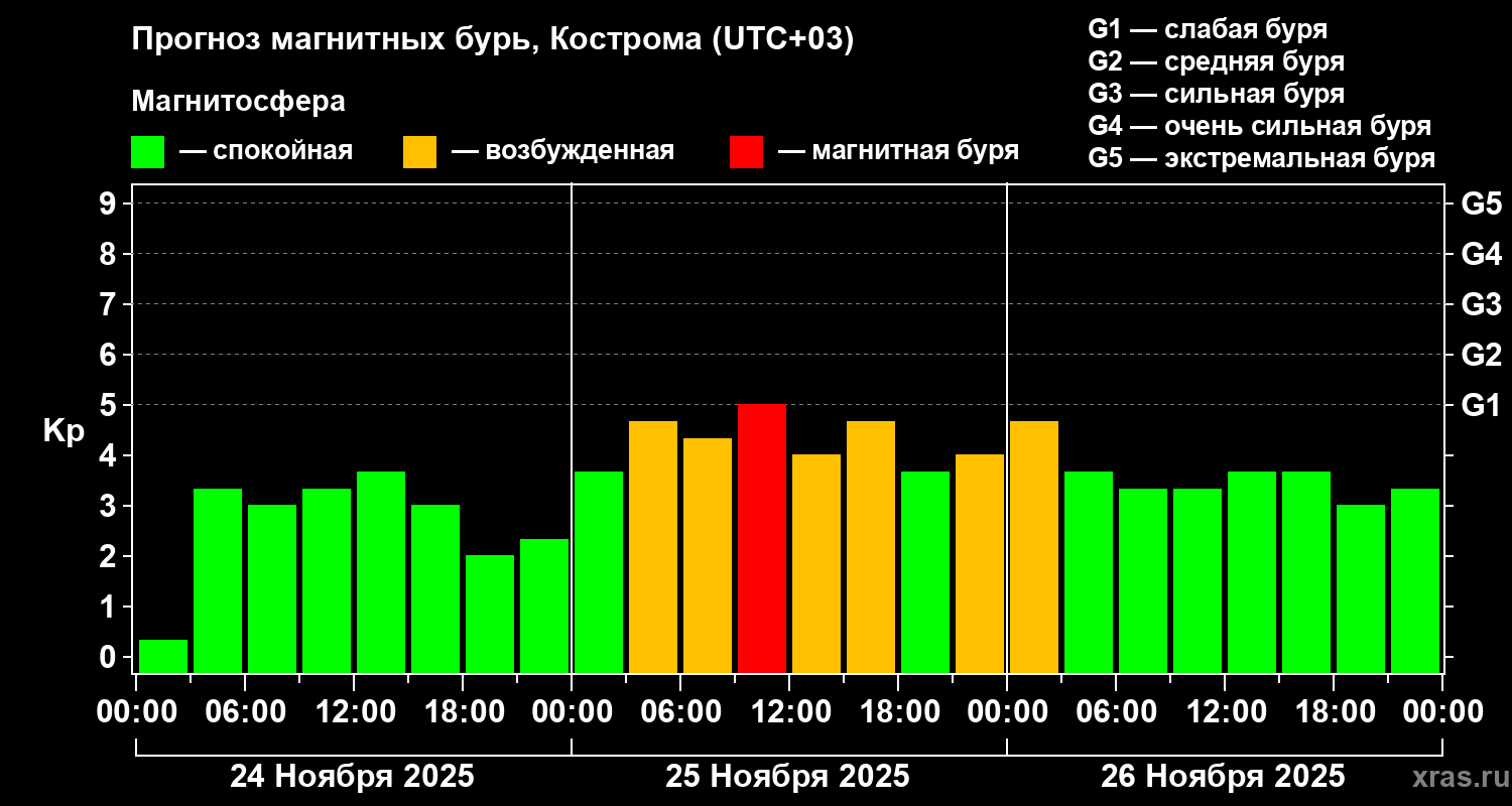 Прогноз магнитных бурь в Костроме — 24 ноября 2025 года