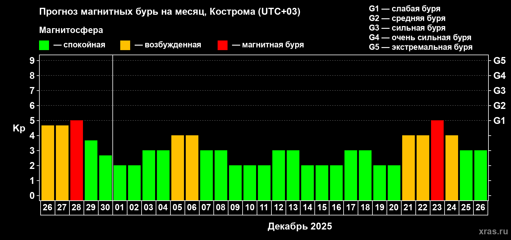 Прогноз магнитных бурь в Костроме — 26 ноября 2025 года