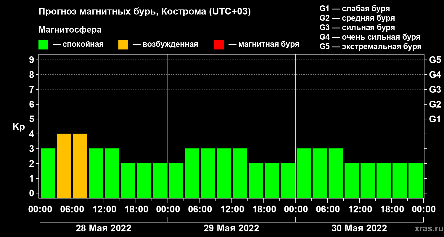 Прогноз магнитных бурь в Костроме на 28 мая 2022 года