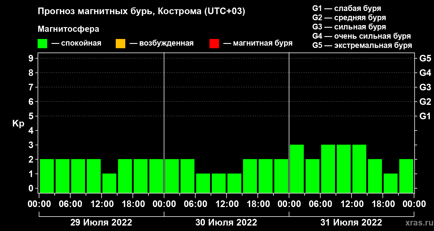 Прогноз магнитных бурь в Костроме на 29 июля 2022 года