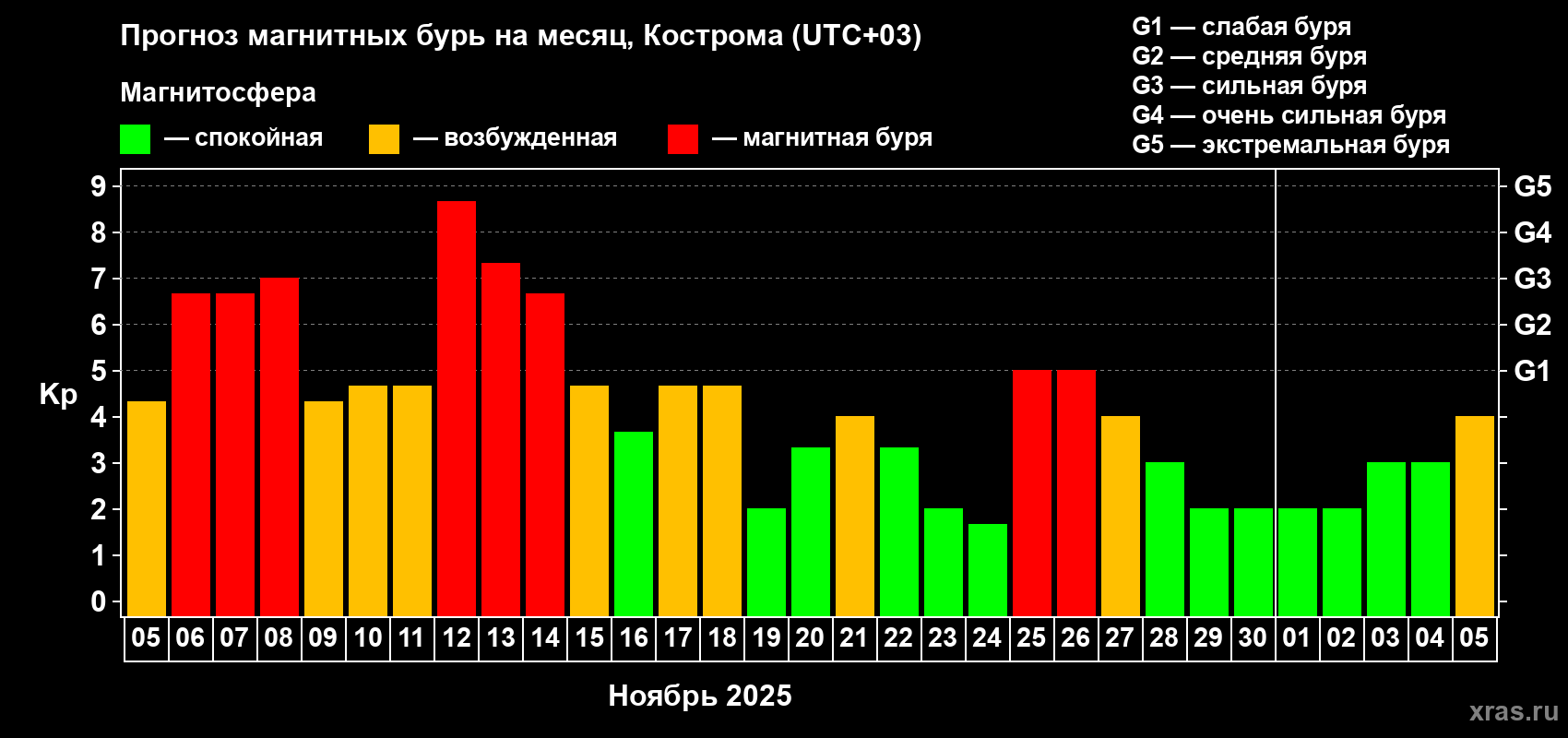 Прогноз магнитных бурь в Костроме — 5 ноября 2025 года