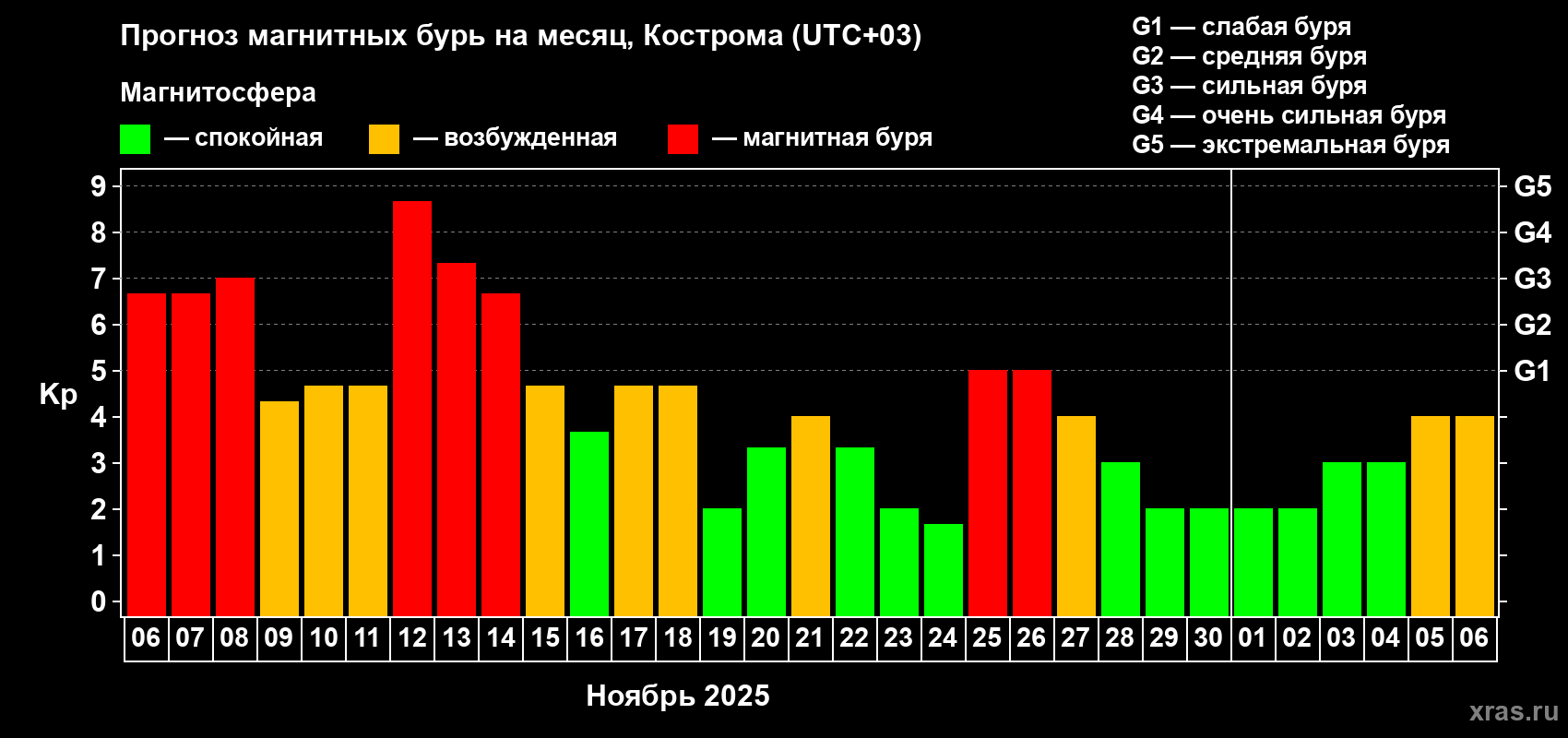 Прогноз магнитных бурь в Костроме — 6 ноября 2025 года