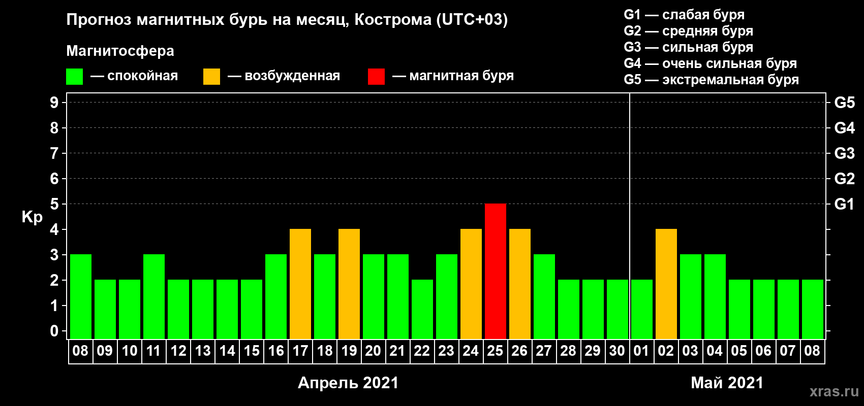 Прогноз магнитных бурь в Костроме на 8 апреля 2021 года